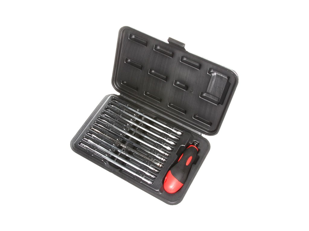 Obustronne bity o długości 175 mm wielkości S4 + S6, S5 + S7, PH1 + PH2, PZ1 + PZ2, T10 + T15, T20 + T25, T30 + T40, H4, H5, H4 mm. Rękojeść 1/4". Pakowanie w pojemniku z tworzywa.
