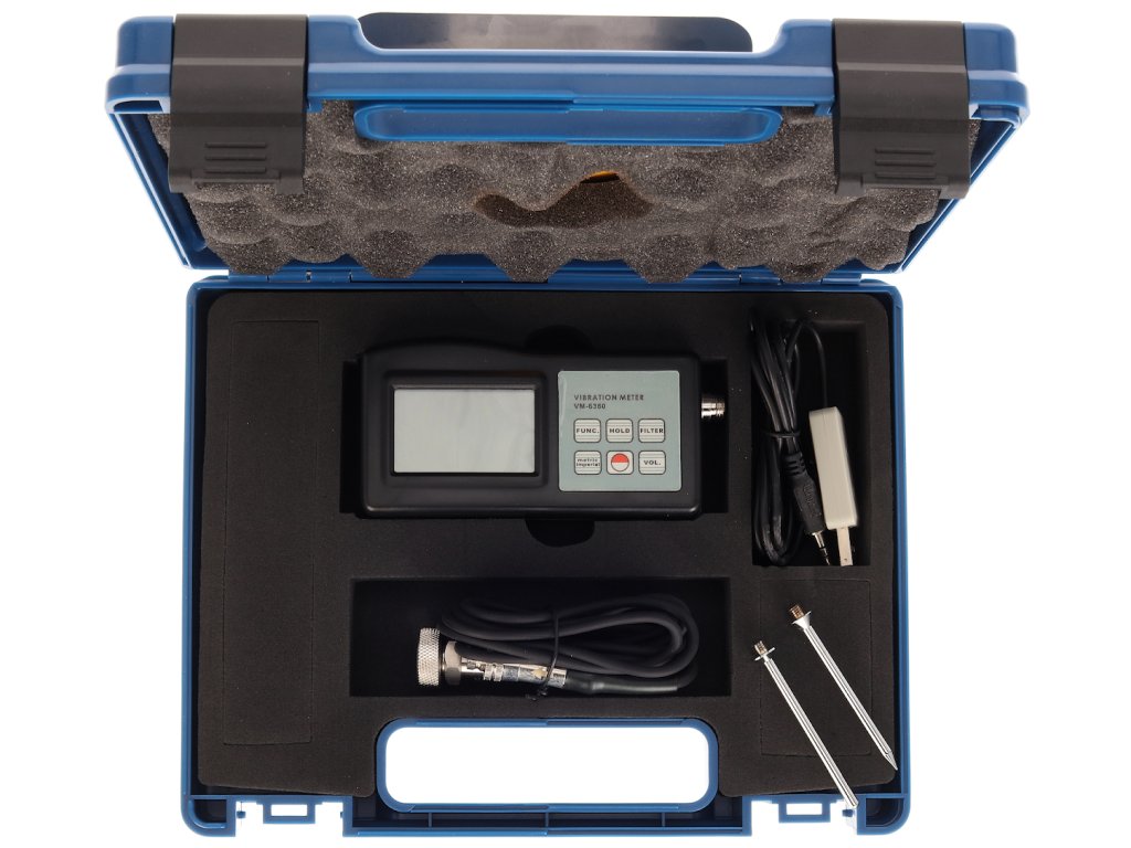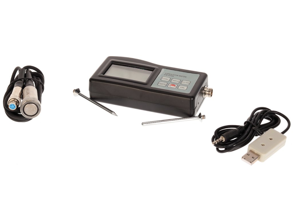 Digitalne urządzenie do pomiaru wibracji, szybkości i przyspieszenia. Wyświetlacz LCD wyraźnie pokazuje pomiary. Konwersja metryczna i miary imperialne. Łatwy w obsłudze. Zestaw w walizce z silnym magnesem mierniczym, sondą (stożkową i kulistą). Zakres wychylenia 0,001 – 4 mm (0,01 – 10 kHz), szybkość 0,25 – 20 cm/s (0,01 – 10 kHz), przyspieszenie 0,1 – 200 m/ s² (0,01 – 1kHz a 0,01 – 10 kHz), zasilanie 4 × 1,5 V AAA baterie, wymiary 124 × 62 × 30 mm, PC rozgałęziacz RS 232C, dokładność ± 5%.