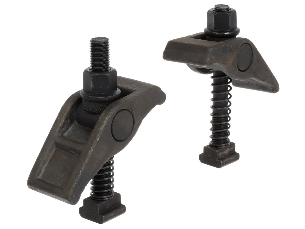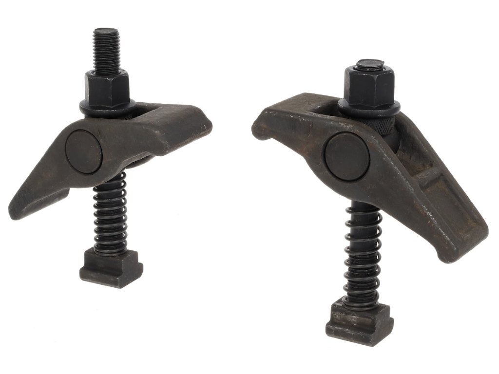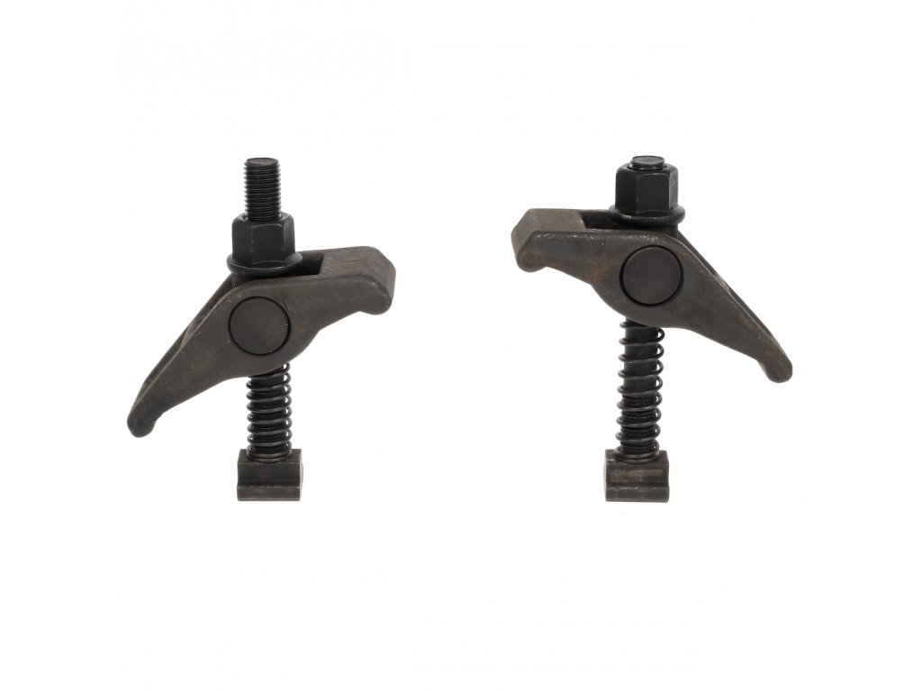 Zestaw 2 szt. uniwersalnych docisków z okrągłą podpórką śruby. Wysięgnik to odlew ze stali z mosiężnymi podpórkami.