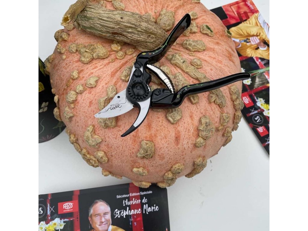 Słynne nożyczki FELCO 8 tym razem wwydanie specjalneStéphane Marie. Uchwyty wykonane z metalizowanego aluminium są najpierw anodowane na czarno podczas produkcji, następnie motyw zielnika Stéphane'a Marie jest nanoszony na czarny uchwyt za pomocą druku UV, a ostateczną warstwę ochronną uchwytów stanowi malowanie proszkowe.