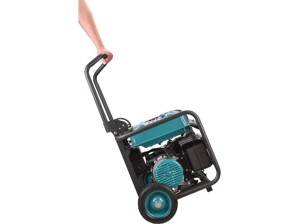 Składany uchwyt i solidne gumowe koła zawarte w dostawie ułatwiają transport generatora do miejsca potrzeby w podobny sposób jak bagaż z uchwytem i kółkami.