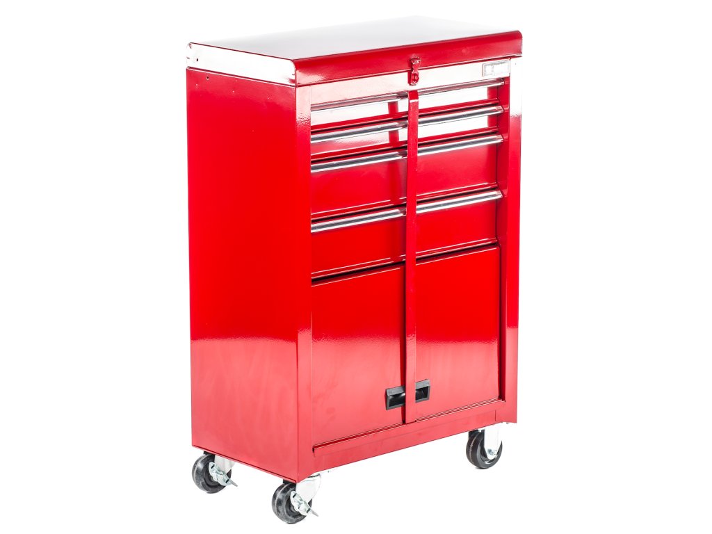Konstrukcja stalowa z powłoką proszkową, 4 kółka prowadzące (przy czym 2 z możliwością pełnego zahamowania), 2 wysokie i 2 niskie szuflady stalowe, ślizgowe wysuwy, półka dolna. Rozmiary szafki 560 × 305 x 755 mm.