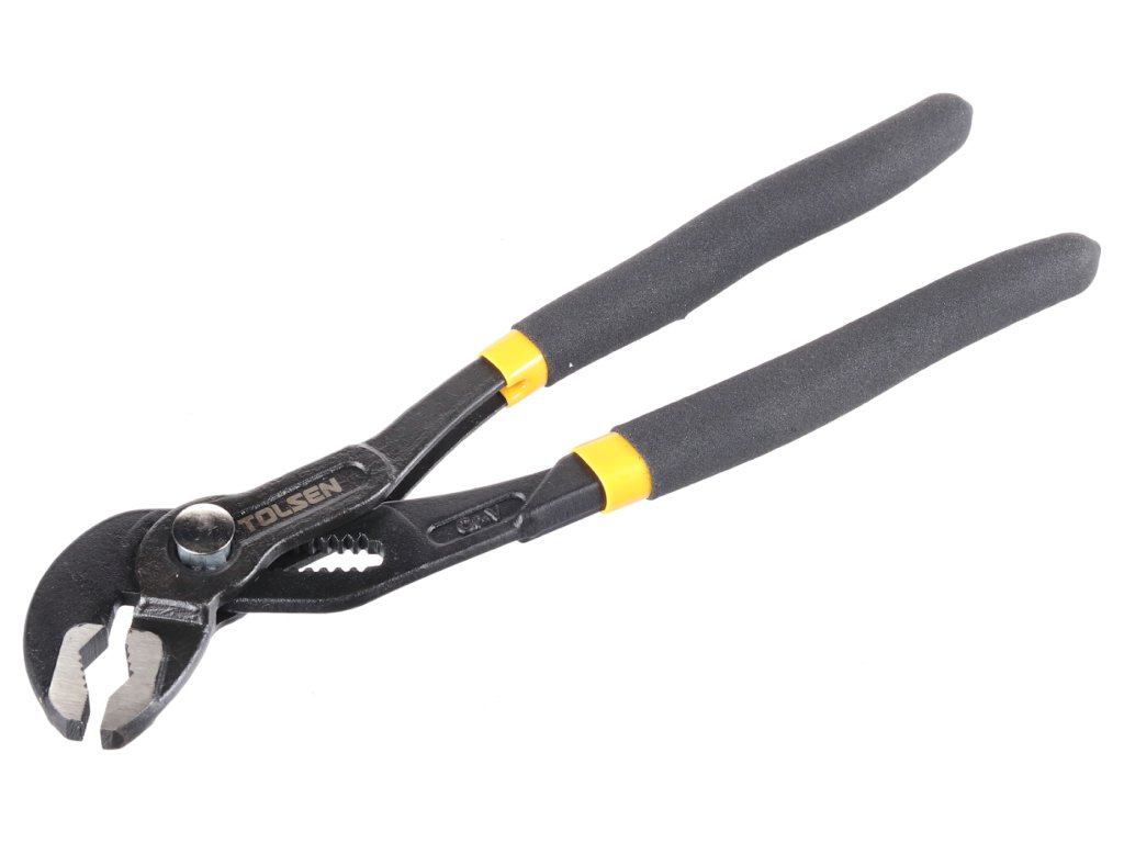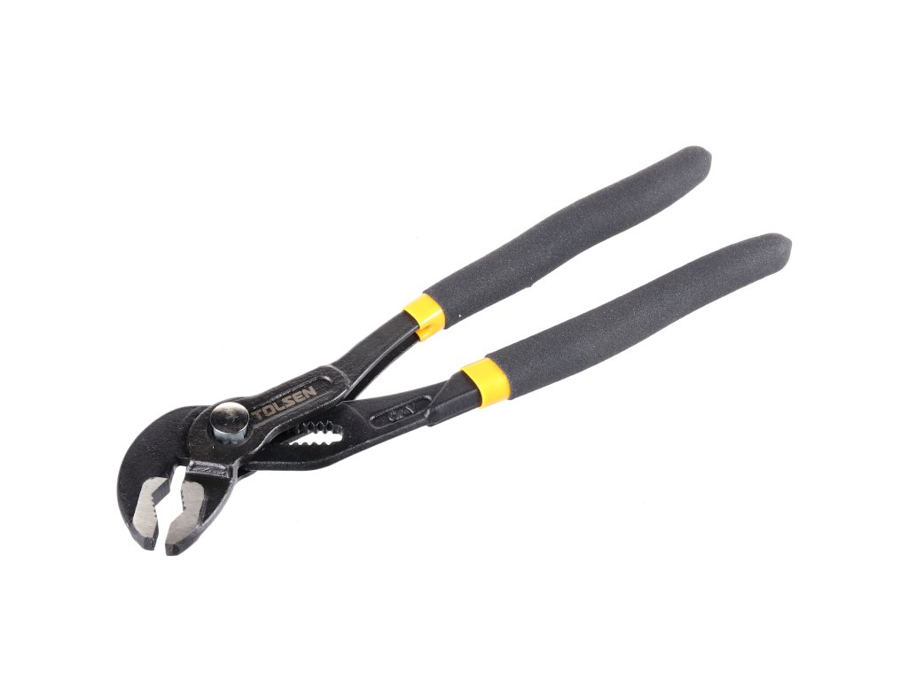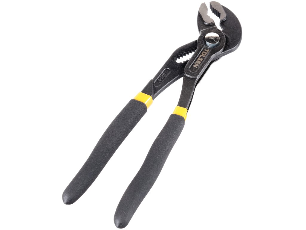 Kleszcze wyprodukowane ze stali CrV, czerniona powierzchnia, rozmiar otworu przy zaciśniętych szczękach 34 mm, uchwyty z tworzywa sztucznego, długość całkowita 270 mm.