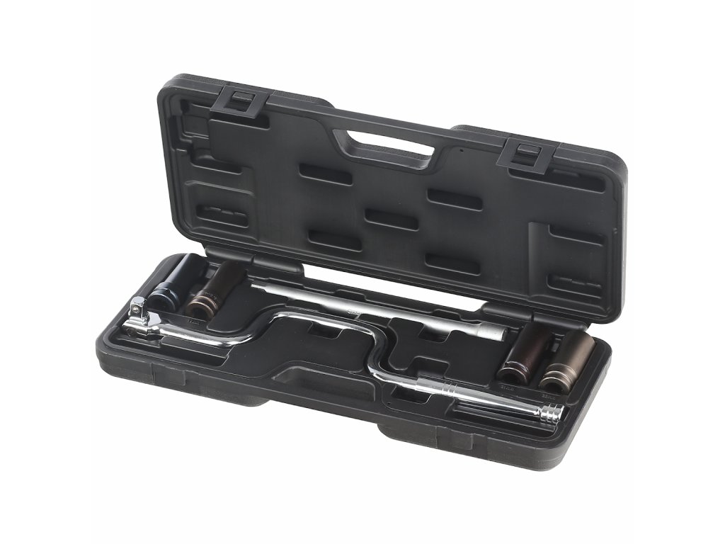 Zestaw do łatwego montażu i demontażu śrub kół. Zestaw zawiera grzechotkę z głowicę obrotową 1/2 ", nasadkę 1/2" - 250 mm i klucze nasadowe o rozmiarach 17, 19, 21, 22 mm.Zapakowane w plastikową walizkę.