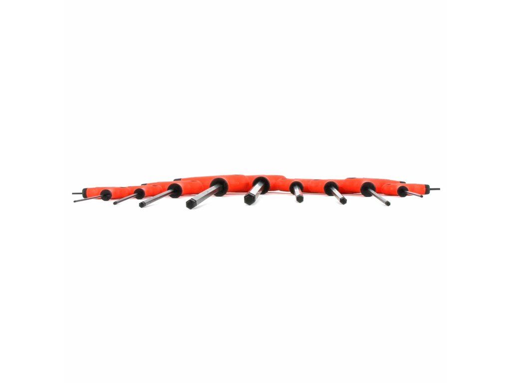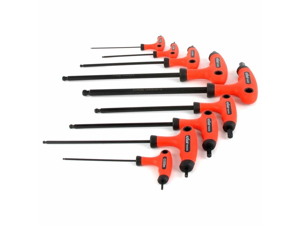 Komplet CrV kluczy imbus z kulką (możliwość wychylenia do 25°) 2; 2,5; 3; 4; 5; 6; 7; 8; 10 mm. Do przeniesienia większej siły - uchwyt w kształcie T.