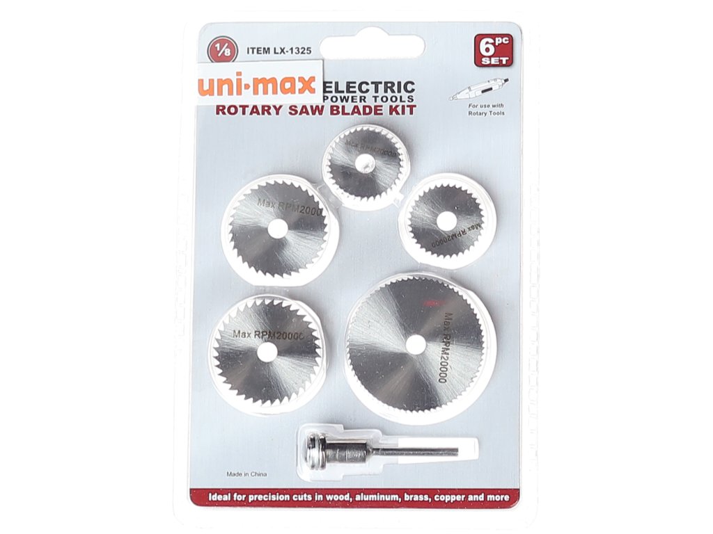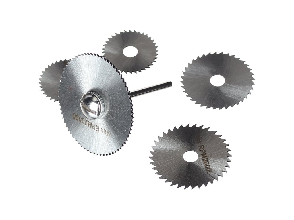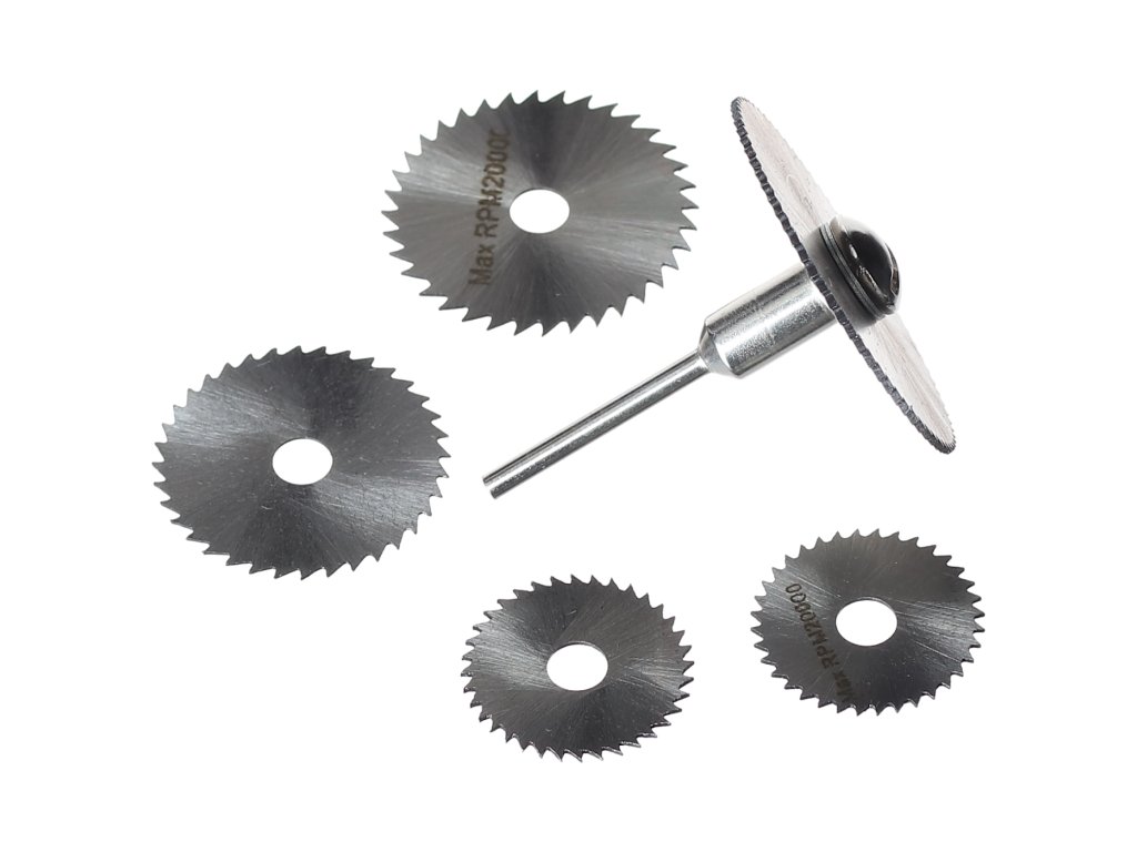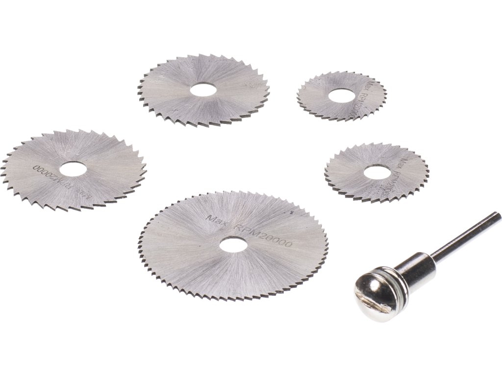 Przeznaczone do precyzyjnego cięcia aluminium, mosiądzu, miedzi, tworzyw sztucznych, itp. z pomocą narzędzi rotacyjnych. Zawiera tarcze o wymiarach 44 × 0,8mm; 35 × 0,7mm; 32 × 0,6 mm; 25 × 0,6 mm i 22 × 0,4 mm z otworem 6,35 mm. Materiał stal szybkotnąca HSS, maks. obroty 20 000/min. Komplet jest uzupełniony trzpieniem zabierającym ze średnicą trzpienia 3,17 mm.