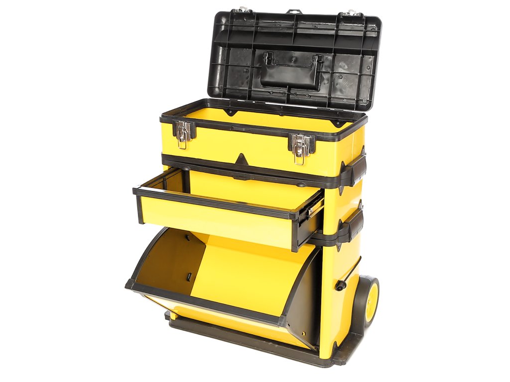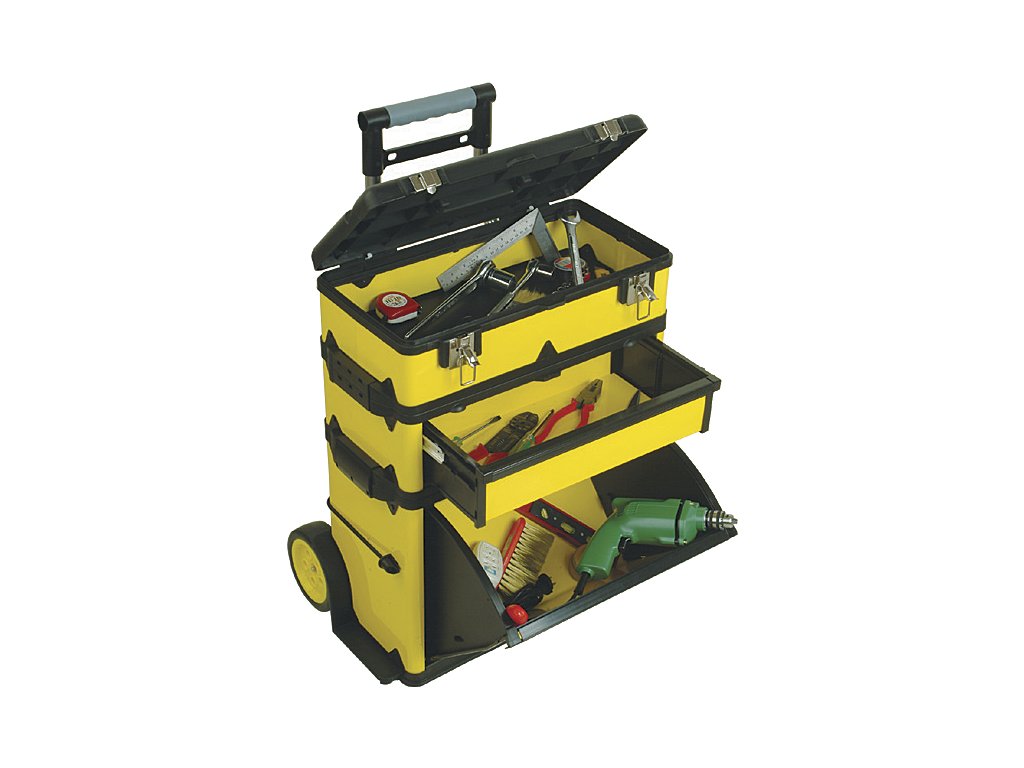 Praktyczny, jezdny pojemnik na narzędzia z trzema oddzielnymi szufladami. Górny pojemnik i szufladę można wyjąć i używać oddzielnie. Pojemnik jest wykonany z materiału PP. Maksymalna długość rączki wynosi 850 mm. Ø kółek 150 mm. wymiary całkowite 580 × 360 × 670 mm.
