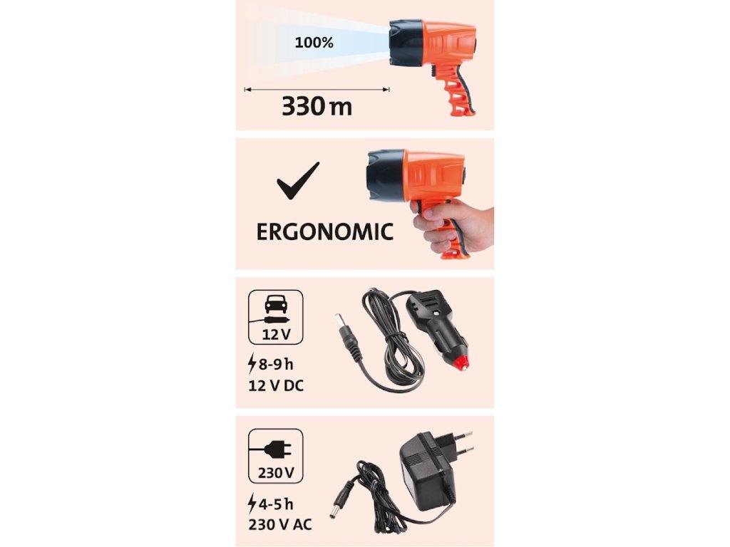 - 3 W, poświata 330 m, 3,7 cala Litowo-jonowa 1500 mAh, czas świecenia na jednym ładowaniu: 2 h, ładowanie: 4 - 5 h, odporny na wilgoć i rozbryzgi wody, ładowanie akumulatora 230 V/ 12 w DC, waga z baterią 380 g