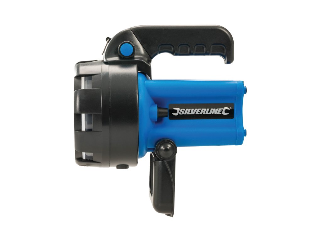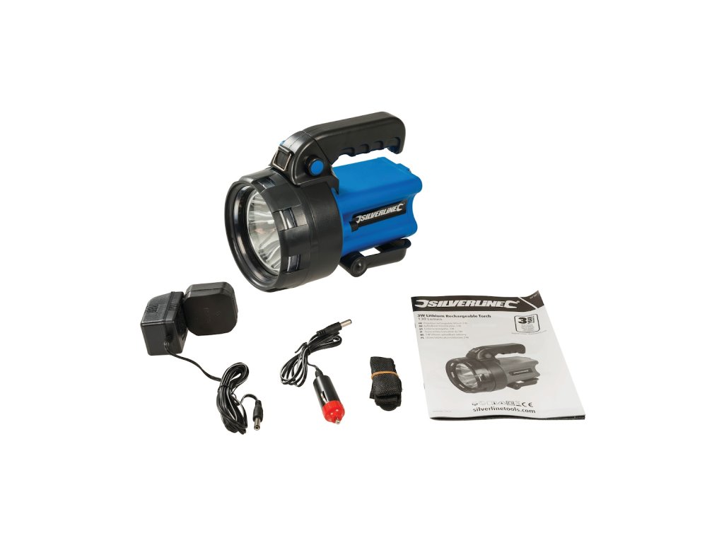 Latarka o dużej mocy z wbudowanym akumulatorem litowo-jonowym 3,7 V 1500 mAh. Uchwyt dostosowuje się do tradycyjnego uchwytu lub chwytaka pistoletowego. Stojak umożliwia obsługę bez użycia rąk. Wytrzymała obudowa odporna na uderzenia. Żarówka LED COB o mocy 150 lumenów. W komplecie ładowarka sieciowa i 12 V ładowarka samochodowa. Czas ładowania 4-5h.