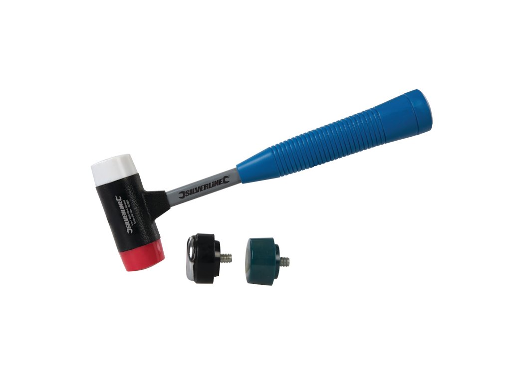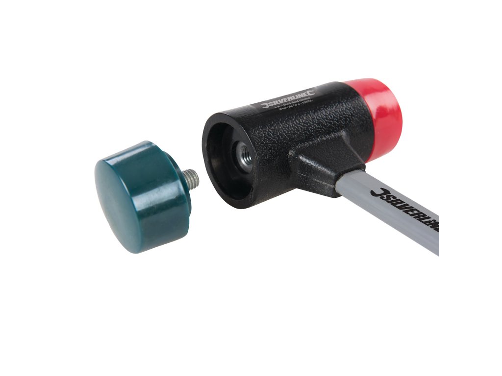 Stalowy trzonek z wymiennymi, nylonowymi głowicami. Średnica powierzchni uderzającej 35 mm. Poręczny uchwyt odporny na olej i substancje chemiczne. W zestawie 3 x nylonowe niepozostawiające śladów głowice, a także 1 x ciężka metalowa głowica.