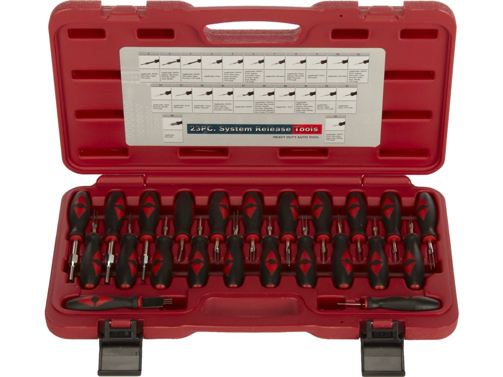 Zestaw jest przeznaczony do odłączania konektorów od wiązek kabli. 23 szt. narzędzi o specjalnych kształtach z rękojeścią pokrywa zapotrzebowanie większości popularnych samochodów. Zapakowane w walizce plastikowej.