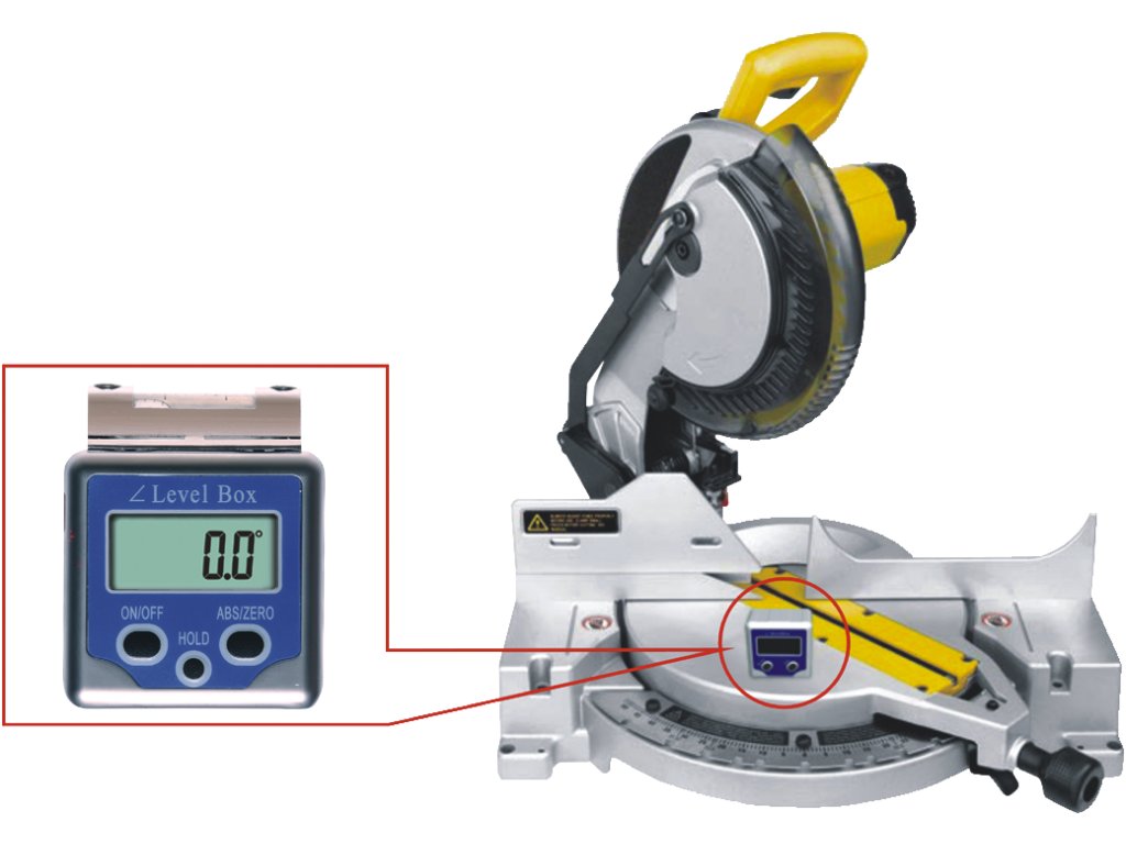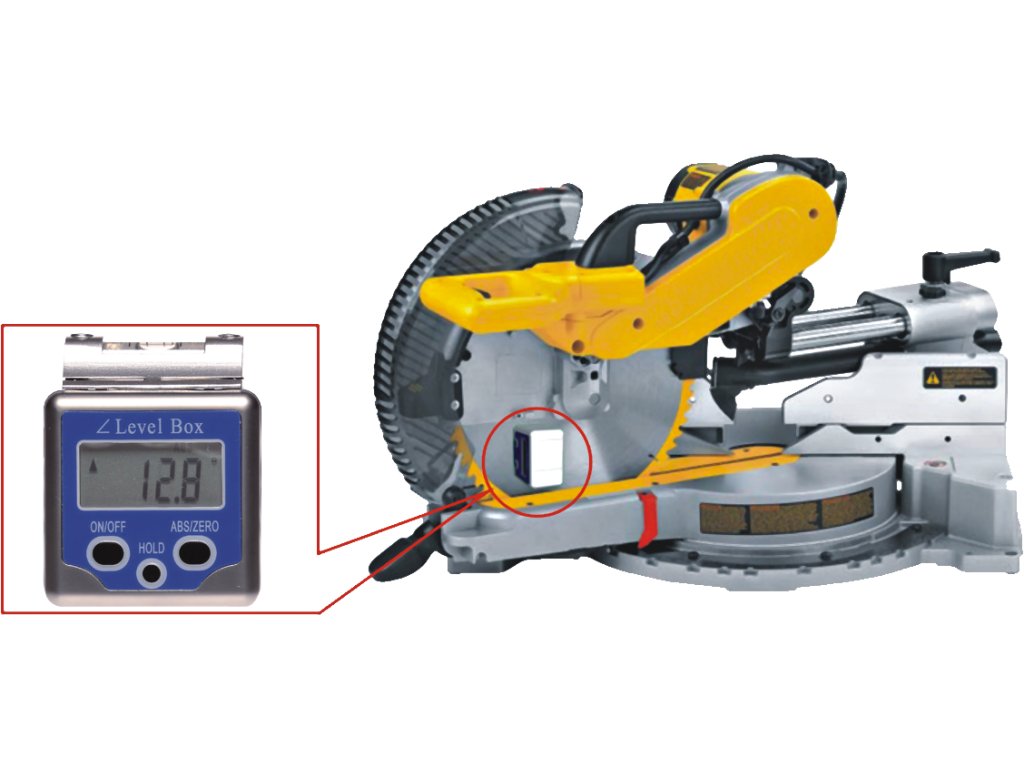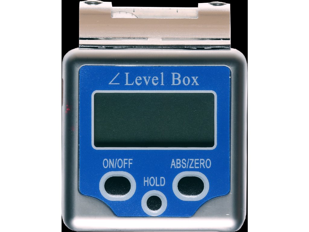 Urządzenie cyfrowe do szybkiego wyświetlenia kąta. Przydaje się np. do sprawdzenia kąta pochylenia tarczy piły ukosowej lub stołowej itp. Magnetyczna podstawa, wyłączenie po 5 min. bezczynności, przycisk zerujący. W celu ustawienia zera absolutnego urządzenie wyposażone jest w libellę. Zasilanie 1 × 3 V CR2032 Lit, zużycie < 100 ξA. Włącznie z futerałem ze skaju i szlufką na pasek. Dostarczane bez baterii.