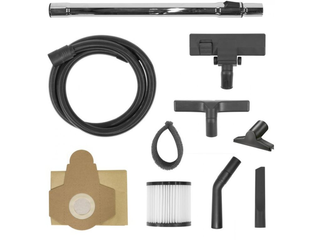 Akcesoria: dysza próżniowa (podłogowa, do suchych/mokrych zabrudzeń, łączona, do tapicerki), teleskopowa metalowa rura, wąż ssący 3 m (średnica wewnętrzna: 35 mm), filtr HEPA, filtr piankowy, worek papierowy 30 l.