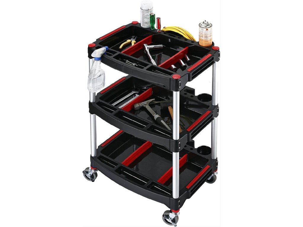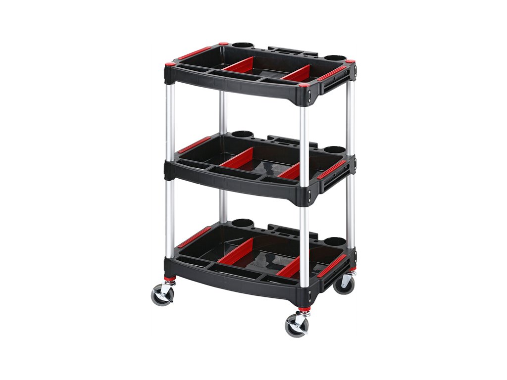 Trzypiętrowy jezdny wózek do przechowywania narzędzi i elementów złącznych. Kółka (2 z hamulcem) o średnicy 75 mm. Materiał Al + PP. Wymiary: 575 × 460 × 900 mm.