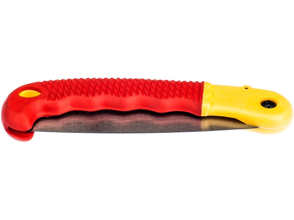 Ręczna piła do drewna, bardzo dobra do ręcznego przecinania drzew i krzewów, zmiękczana rękojeść z tworzywa, znajdzie zastosowanie w ogrodach, w gospodarstwach domowych i warsztatach. Składany brzeszczot z wysokiej jakości stali węglowej 0,7 × 38 × 180 mm z zamkiem zabezpieczającym, podział utwardzanych zębów 3 mm, mocna miękka rękojeść PP i TPR.