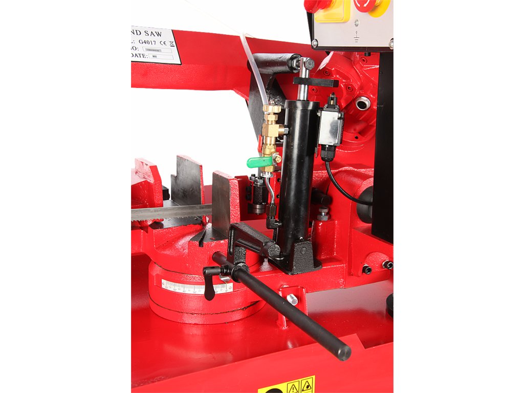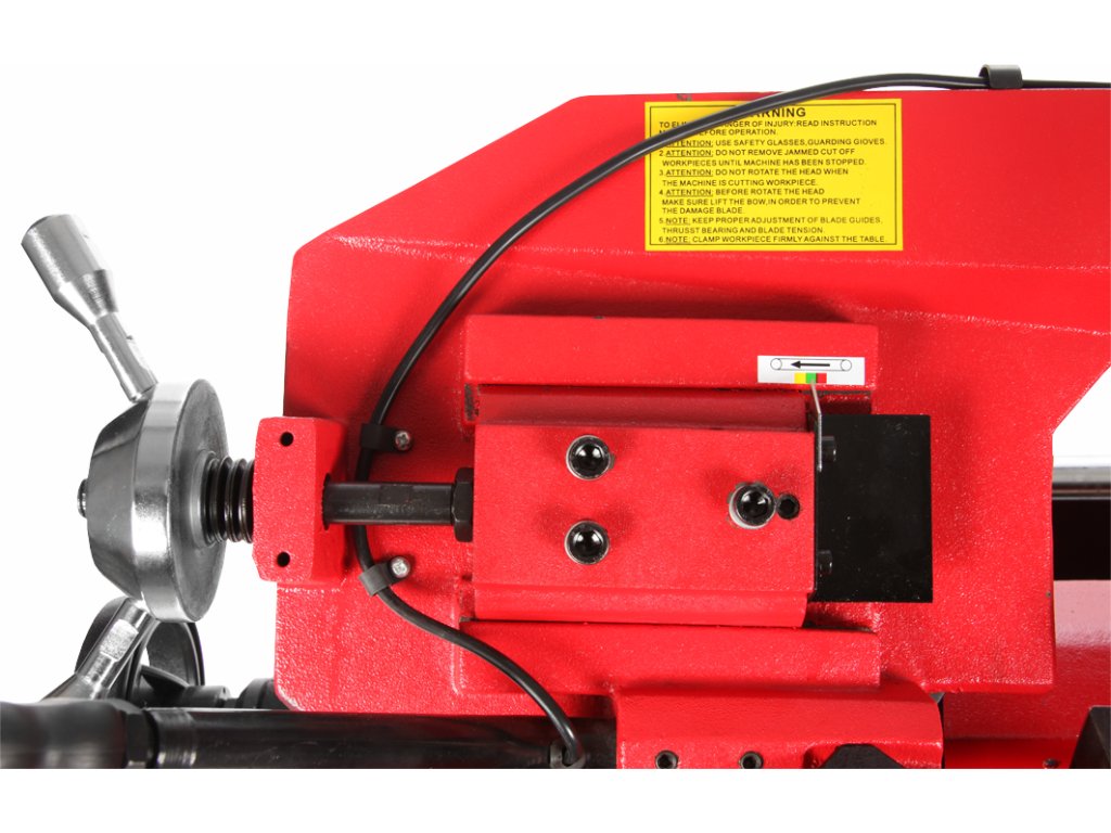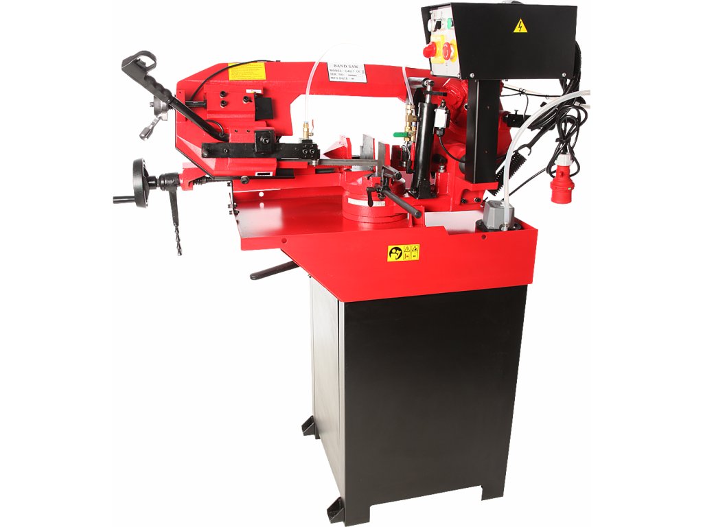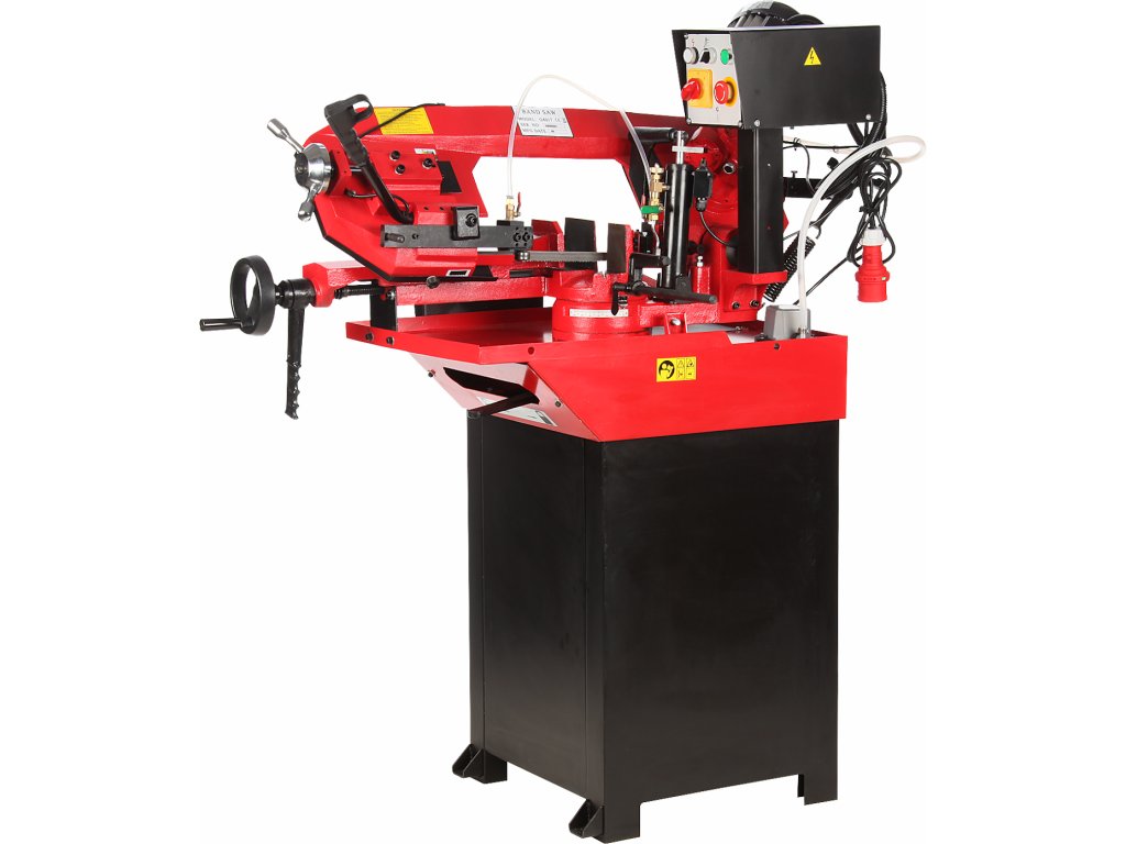 Pilarka taśmowa do cięcia stali, wyposażona w wychylny wysięgnik obrotowy wykonany z żeliwa. Maszyna oferuje komfort przejrzystego panelu kontrolnego, funkcję chłodzenia i wskaźnik naprężenia taśmy tnącej, jest wyposażona w masywne imadło.