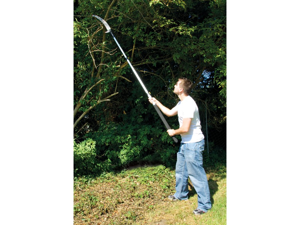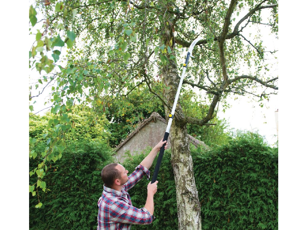 - Trzonek teleskopowy o regulowanej długości 1,5–2,5 m do sięgania wysokich gałęzi