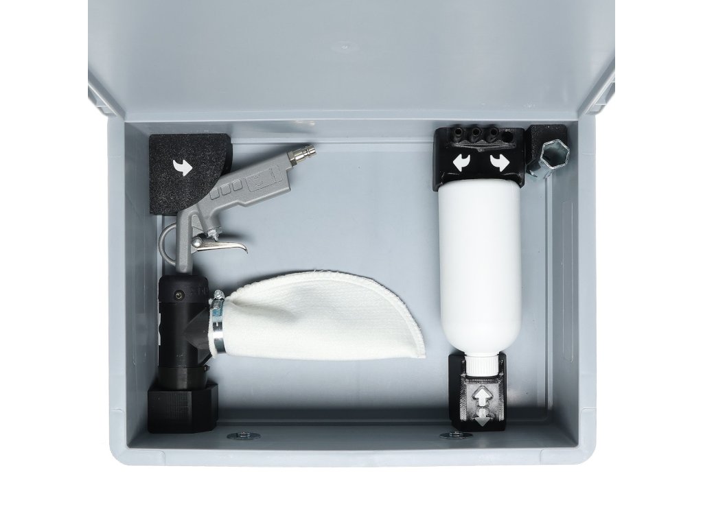 Zużycie powietrza 12 m³/godz., ciśnienie robocze 0,5 – 0,8 MPa, uziarnienie piasku P40 – P280 (dostarczamy jako materiał eksploatacyjny), napełnianie piaskiem około 2 – 5 cm³.