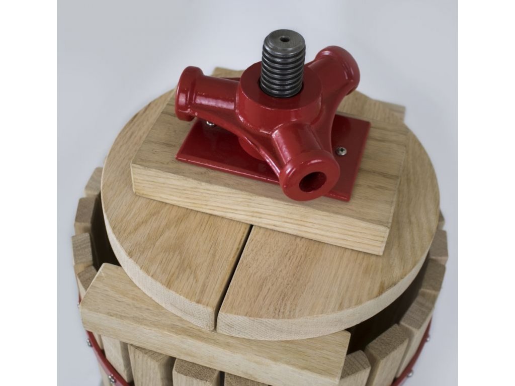 Konstrukcja: wytrzymałe stalowe wrzeciono, drewniany kosz prasujący, miska zbiorcza (średnica →: 370 mm; obróbka powierzchni zgodnie z normami dotyczącymi materiałów przeznaczonych do kontaktu z żywnością).