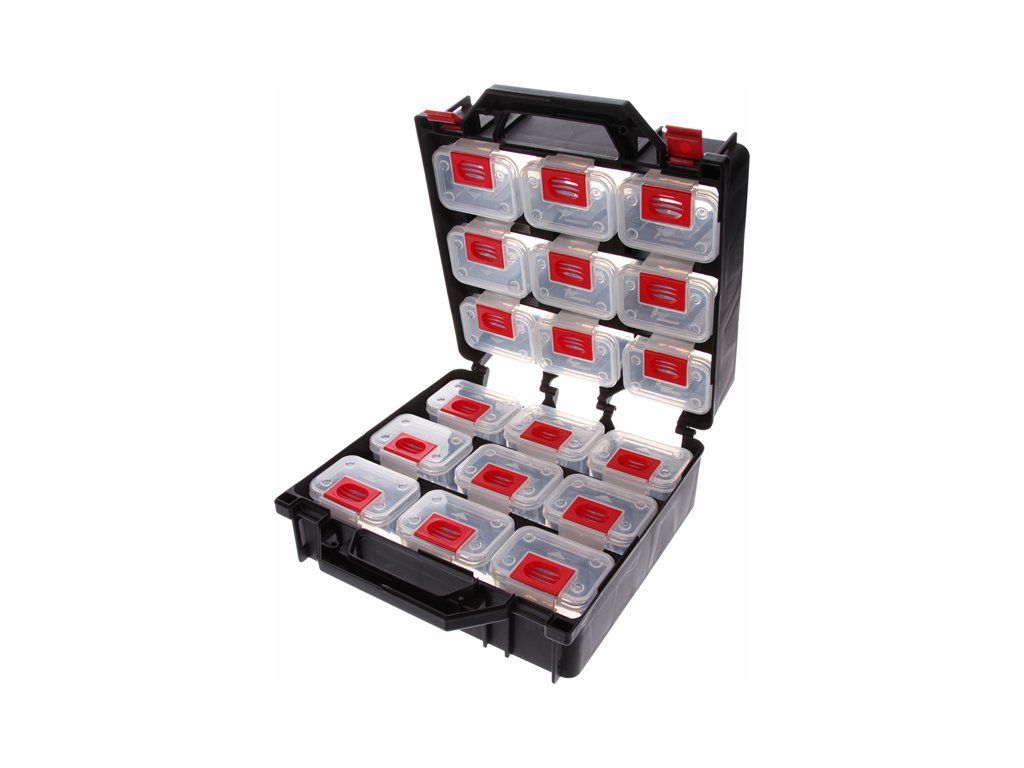 Praktyczny organizer z 18 oddzielnymi pojemnikami idealnie nadaje się do przechowywania śrubek, kołków, gwoździ czy drobnych narzędzi. Każdy pojemnik posiada własny klips umożliwiający przypięcie do paska – doskonałe rozwiązanie do pracy w terenie, na drabinie lub w warsztacie. Wyjmowane pojemniki pozwalają zabrać tylko to, czego potrzebujesz. Wykonany z wytrzymałego plastiku, z przezroczystą pokrywą i solidnym zamknięciem.