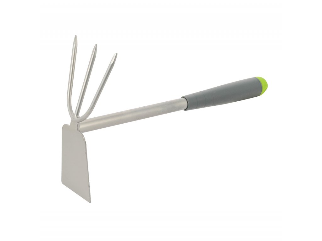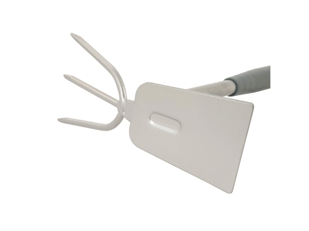 Odporny na korozję kultywator z motyką oraz malowaną proszkowo stalową powierzchnią roboczą narzędzia. Plastikowa rączka z otworem do zawieszenia. Rozmiary głowicy motyki : dł. x szer. - 90 x 65 mm, rozmiary głowicy kultywatora: dł. x szer. - 100 x 90 mm.
