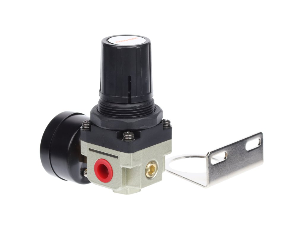 Zawór redukcyjny o mocnej konstrukcji. Gwint przyłączeniowy 1/4". Skala manometru skalibrowana 0–1 MPa + 0–150 Psi. Prędkość przepływu powietrza 3000–3500 l/min.