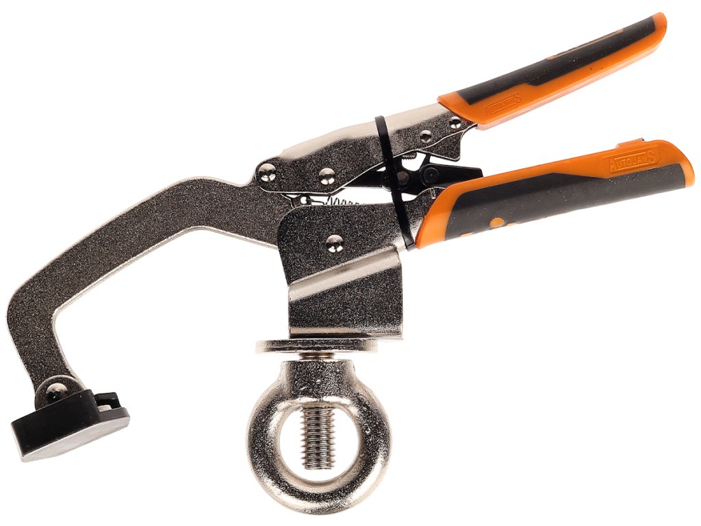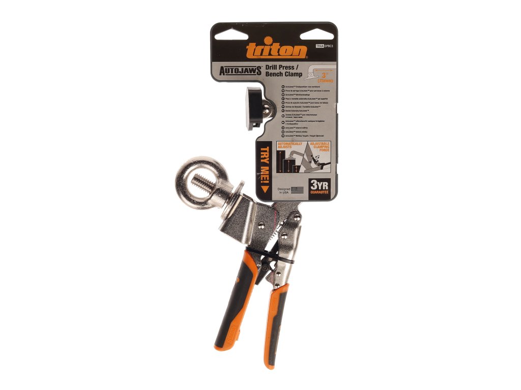 Trwała, w całości metalowa konstrukcja z ergonomicznymi uchwytami. Dzięki technologii AutoJaws ™ ścisk dostosowuje się automatycznie do grubości materiału do 75 mm i umożliwia obsługę jedną ręką. Opatentowany mechanizm cam-lock utrzymuje stałą siłę zacisku 10–110 kg przy dowolnej grubości materiału bez potrzeby ponownej regulacji. Siłę zacisku można regulować za pomocą śruby pod uchwytem. Przeznaczony do użytkowania na stole roboczym lub, po wymianie śruby, również do mocowania do rowków „T” 22/25 mm w stole wiertarki kolumnowej.