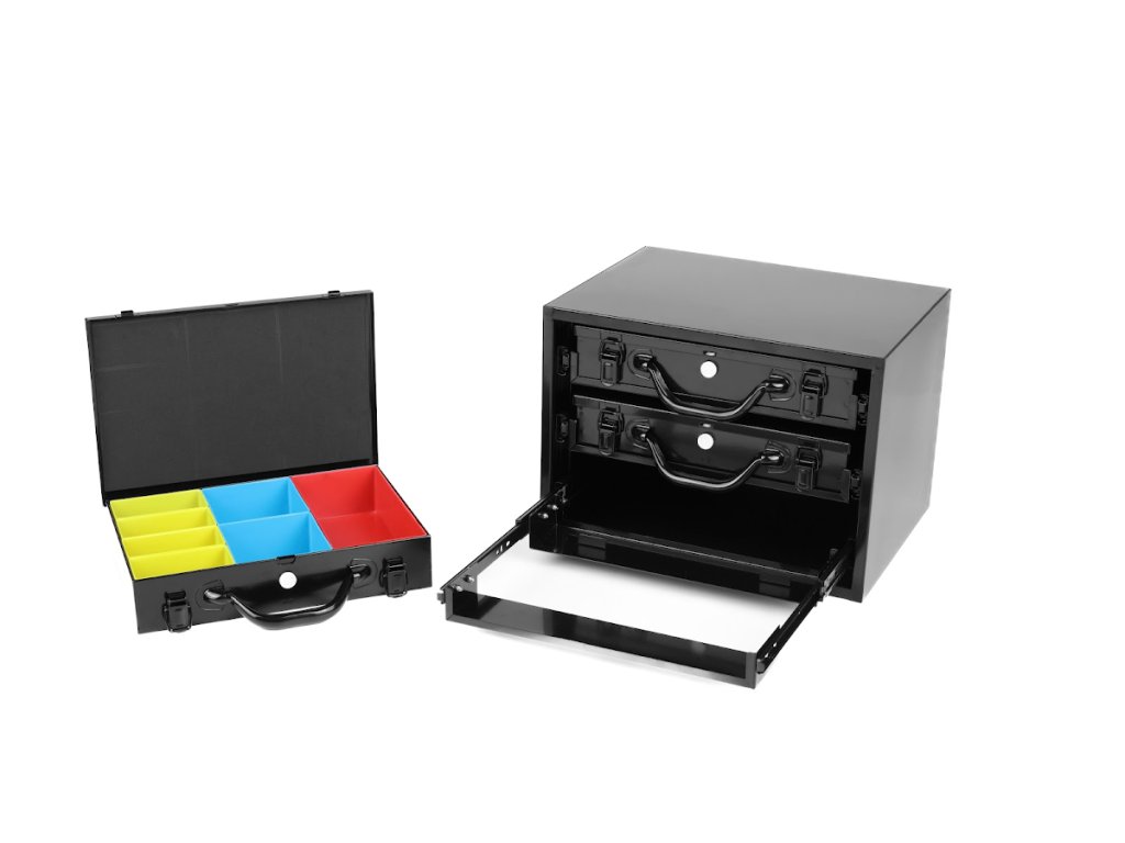 Solidna skrzynka z blachy stalowej oferuje trzy przestronne szuflady na prowadnicach kulkowych, które zapewniają płynne i niezawodne działanie nawet przy większym obciążeniu. Szuflady są zamykane na klucz i jednocześnie przenośne, dzięki czemu można łatwo przenosić całe zestawy narzędzi lub części. Każda szuflada wyposażona jest w zestaw plastikowych pojemników o różnych rozmiarach, które pomagają utrzymać porządek przy przechowywaniu wierteł, drobnych elementów czy materiałów złącznych. Powierzchnia skrzynki pokryta jest trwałą powłoką proszkową, chroniącą przed zarysowaniami i korozją.