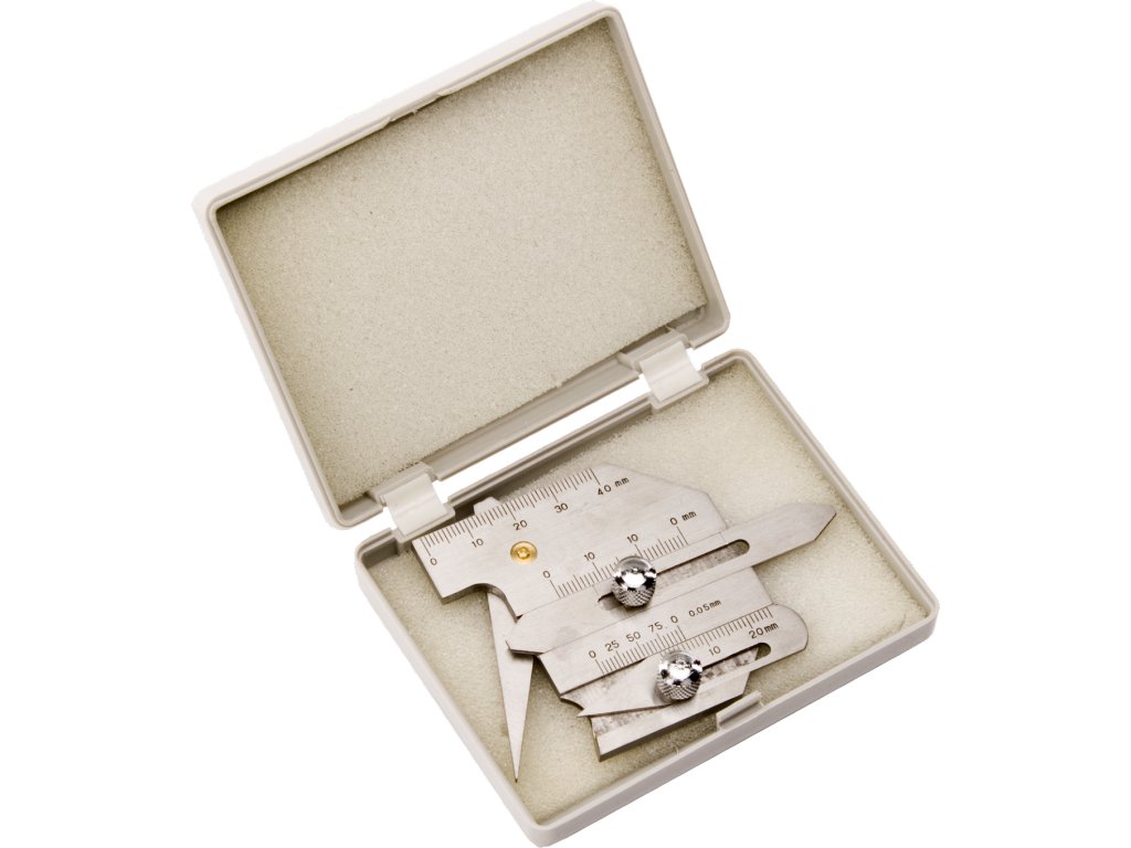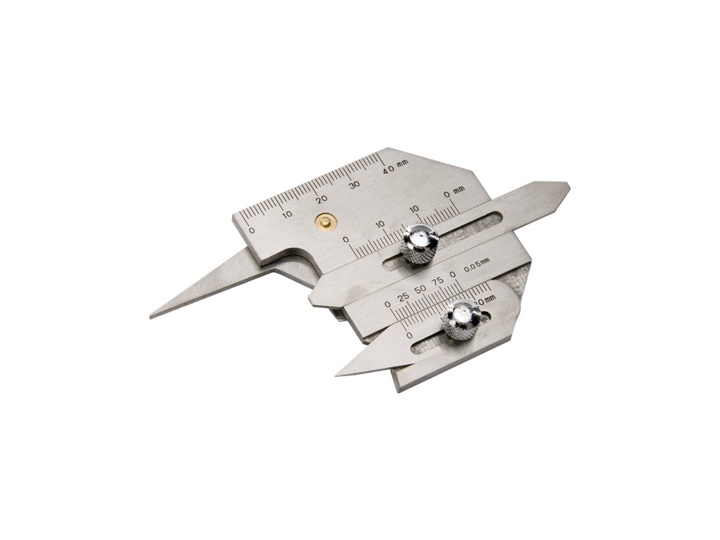 Wykonany ze stali nierdzewnej, łatwo przenośny, o mocnej budowie, łatwa obsługa i szeroki zakres zastosowań. Zestaw do pomiaru wysokości, kąta ukosowania, szerokości, szczeliny i głębokości rowka spawalniczego. Grubość spawanej części 40 mm z dokładnością 0,2 mm, wysokość płaszczyzny i spoina pachwinowa 20 mm z dokładnością 0,2 mm, grubość spoiny pachwinowej 15 mm z dokładnością 0,2 mm, kąt ukosowania spawanej części 0 – 60° z dokładnością 30', wielkość szczeliny 1 – 3 mm z dokładnością 0,1 mm.