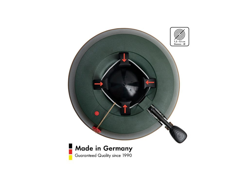 Obecna seria Comfort Grip została ulepszona o nowy pedał bezpieczeństwa. Znacznie większa powierzchnia bieżnika zapewnia najlepszą możliwą przyczepność stopy lub buta podczas naciskania pedału. Wszystkie stojaki na choinki KRINNER są wyposażone w sprawdzoną oryginalną technologię pojedynczej liny do wszystkich rodzajów choinek i gwarantują równomierny nacisk uchwytów na pień choinki. Wystarczy umieścić choinkę na stojaku, nacisnąć pedał i gotowe! Niezależnie od tego, czy choinka jest gruba, cienka czy krzywa, stoi stabilnie i pionowo. Opatentowany pas bezpieczeństwa ze stopniowym mechanizmem otwierania zapewnia dodatkowe bezpieczeństwo i zapobiega przypadkowemu przewróceniu się drzewa.