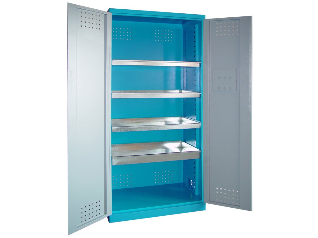 Wyposażenie: szafka dwudrzwiowa (→ zamkiem cylindrycznym/rozstawem osi - zamek podwójny, 2 klucze); 4 wysuwane tace wykonane z blachy ocynkowanej (→ opcjonalna regulacja wysokości, nośność: 30 kg); system wentylacji szafy (→ perforowany korpus/drzwi).
