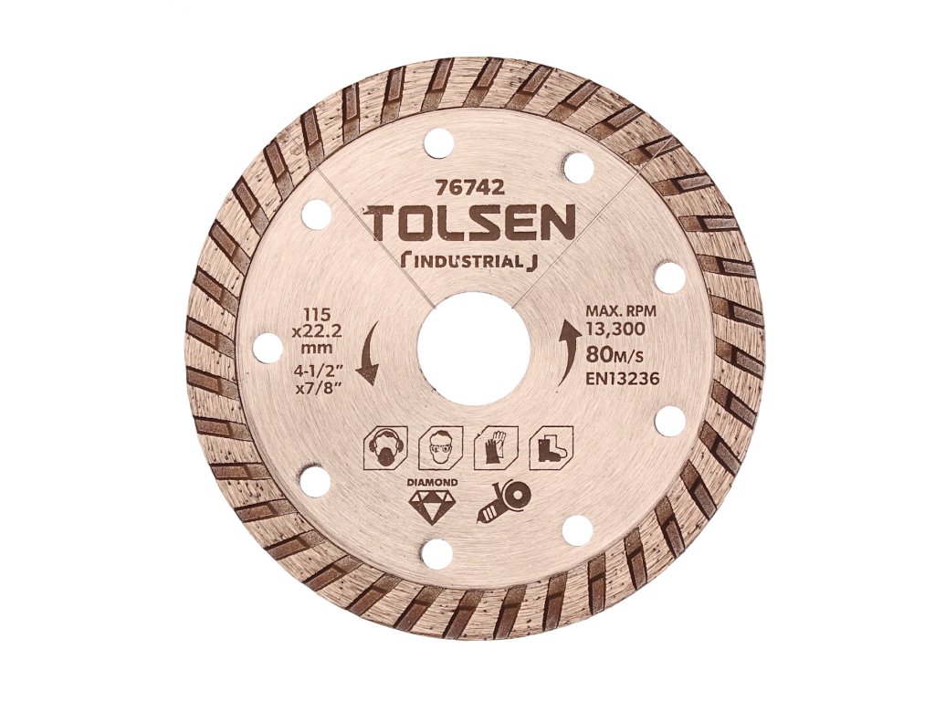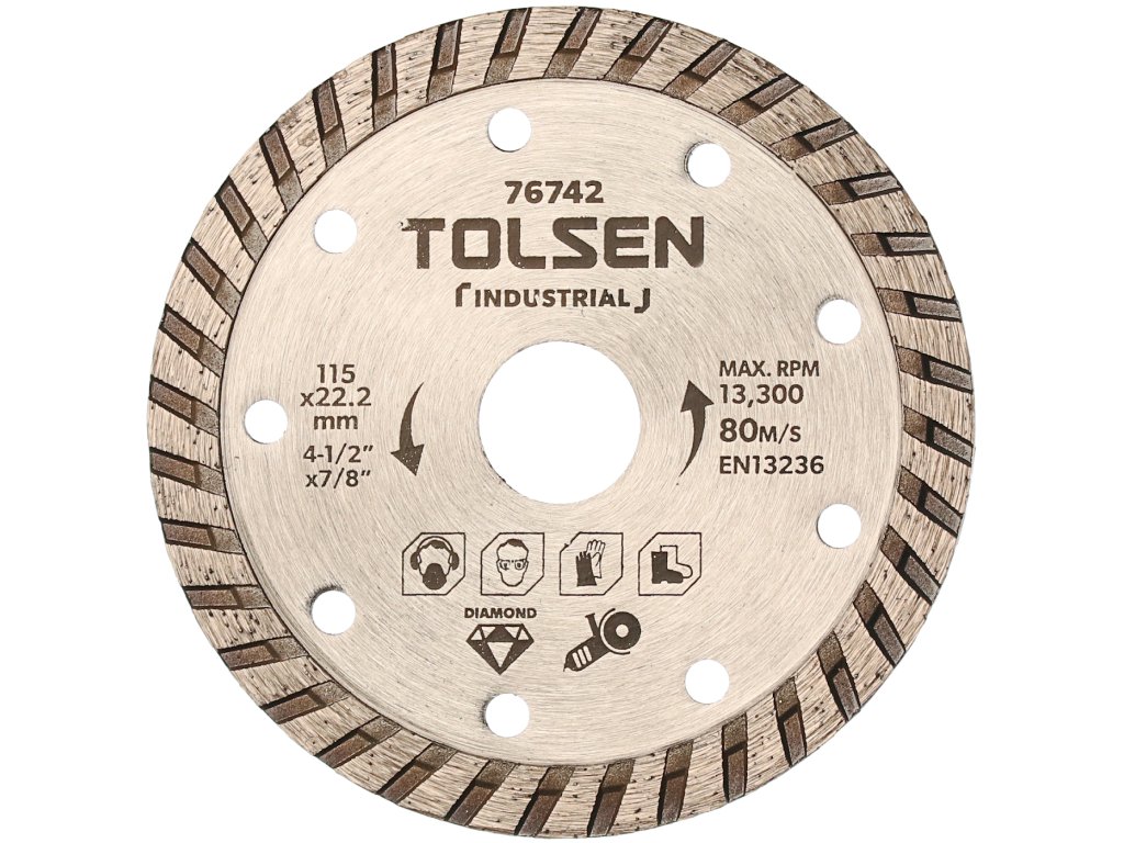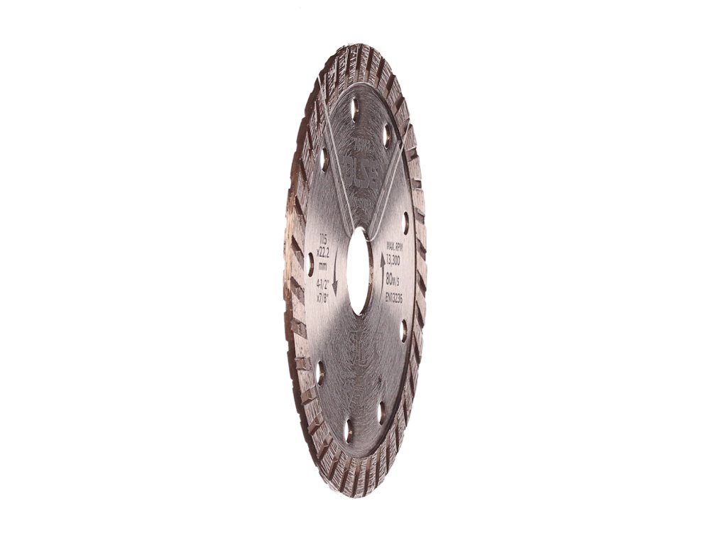 Jakościowa diamentowa tarcza Turbo przeznaczona jest do suchego cięcia murów, cegieł, pokrycia dachowego i innych materiałów budowlanych. Wysokość segmentu 10 mm. Maks. obroty 13 300 ot/min.