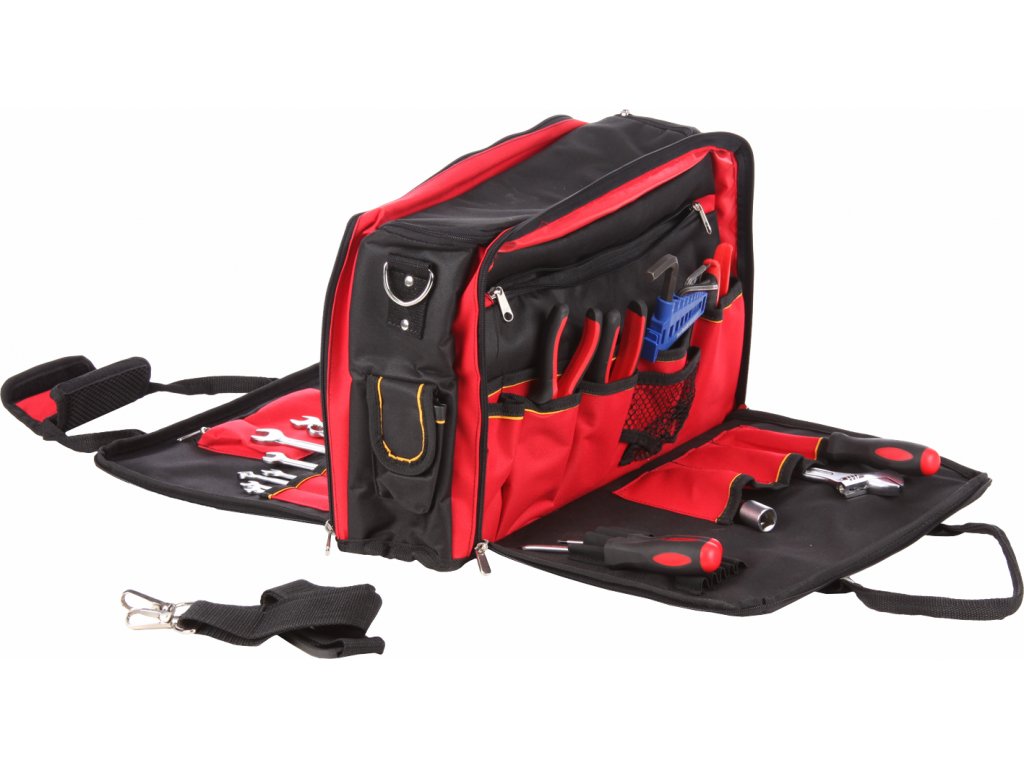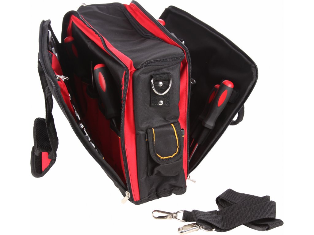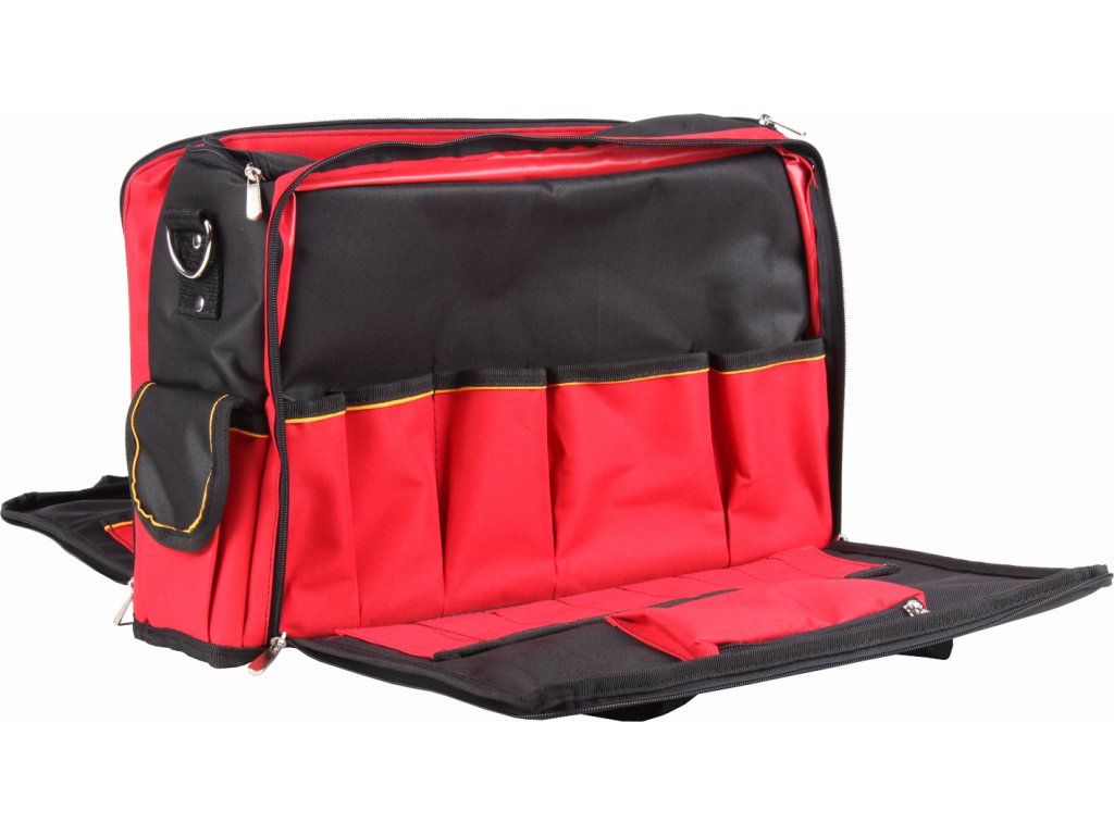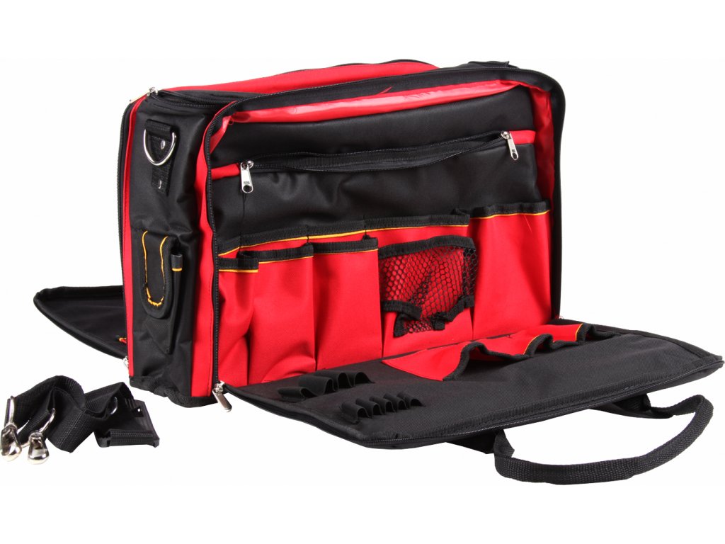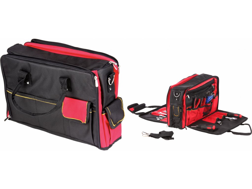 Wytrzymała torba tekstylna na narzędzia, posiada dwie otwierane kieszenie na 31 szt. narzędzi oraz 9 uchwytów na drobne narzędzia. Na bokach 3 × mała kieszonka na rzepa oraz 2 kieszenie otwarte. Wewnętrzna duża kieszeń jest odpowiednia nie tylko do przechowywania narzędzi AKU. Możliwość przenoszenia w ręce lub za pomocą odpinanego paska na ramię. Wymiary 420 × 190 × 300 mm.