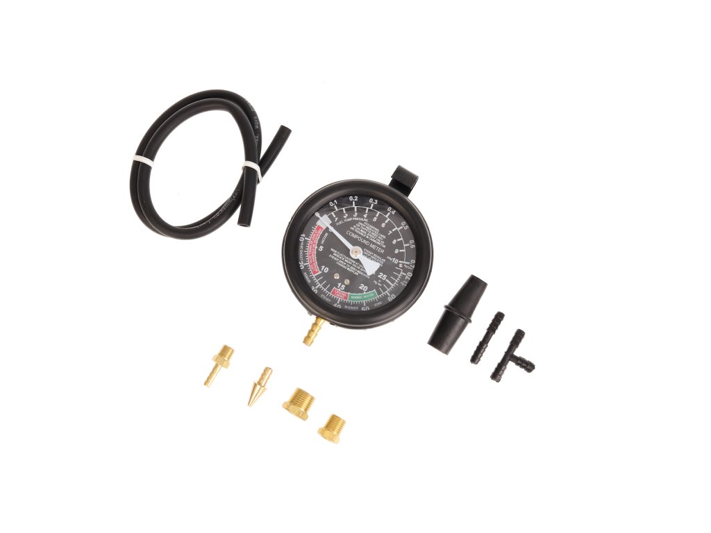 Tester do testów ciśnieniowych i podciśnieniowych pomp mechanicznych i elektrycznych pomp paliwowych. Może też diagnostykować szeroką skalę problemów silnika. Długi giętki wąż z uniwersalnymi adapterami. Zestaw w walizce plastikowej.