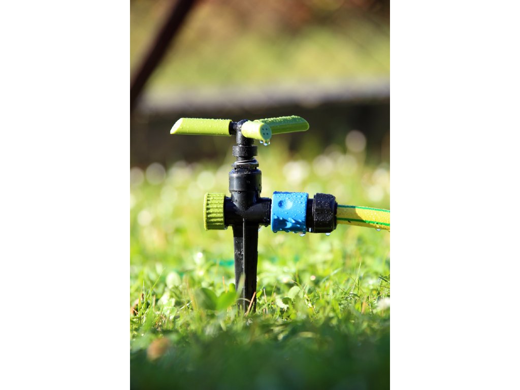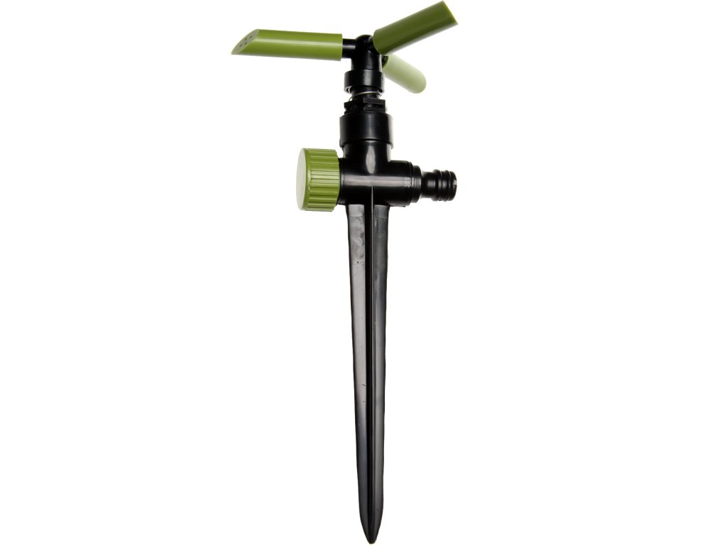 Rotacyjne urządzenie z tworzywa ABS do podlewania posiada kołek do prostego wbijania do ziemi. Trzy rotujące dysze mogą podlewać powierzchnię do 110 m² z minimalnym ciśnieniem wody 1,5 bar. Nastawny rozprysk, konektor przyłączeniowy 3/4".