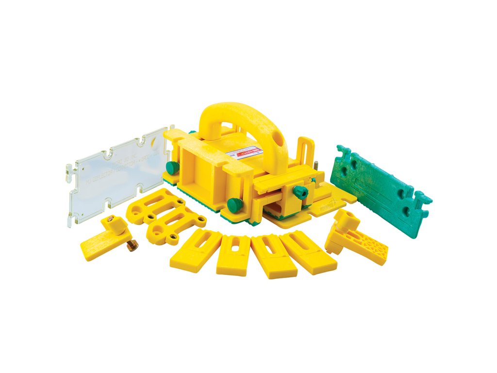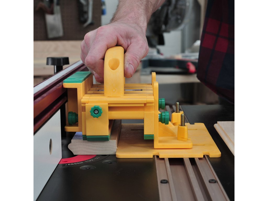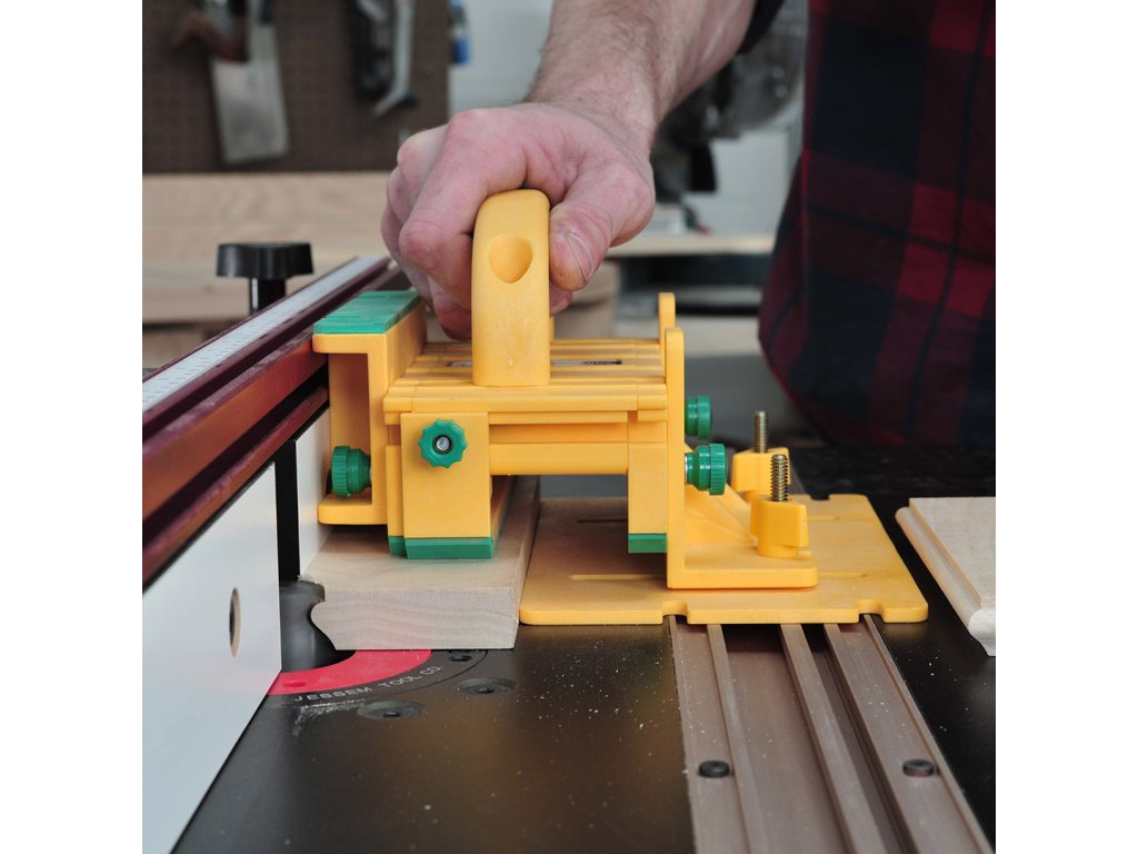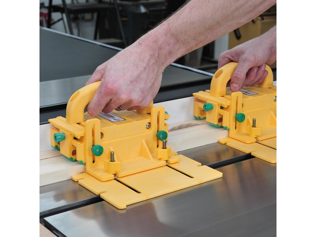 Kompletny zestaw szablonów przesuwnych z płytą stabilizującą i innymi akcesoriami do użytku z pilarkami stołowymi, stołami frezarskimi, piłami taśmowymi i frezarkami stolarskimi. Płyta stabilizująca zapewni jeszcze większą kontrolę nad obrabianym produktem. Blok dociskowy GRR-RIPPER® 3D został zaprojektowany tak, aby umożliwić wykonywanie najbardziej precyzyjnych cięć przy jednoczesnej ochronie dłoni. Z łatwością wykonuj trudne cięcia i zapobiegaj odbiciu jak nigdy dotąd.