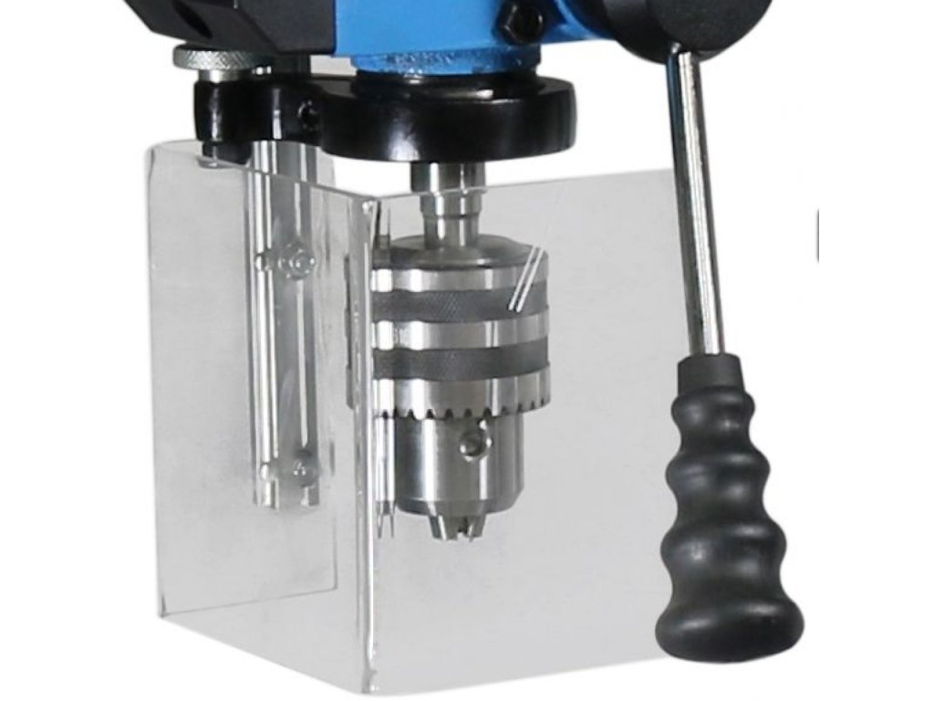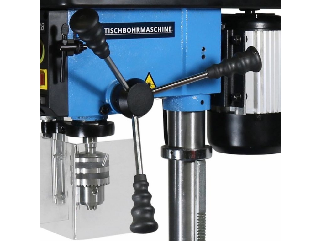 Uchwyt z obręczą zębatą do narzędzi i wierteł ø 3 - 16 mm (→ bicie: < 0,02 mm), regulacja głębokości wiercenia (→ 1 - 50 mm; dla większych serii obrabianych przedmiotów), składany stół warsztatowy (→ wiercenie pod kątem; zakres: ± 45°).