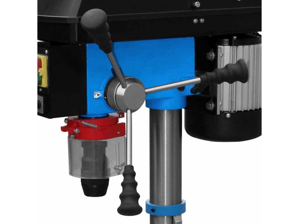 Uchwyt szybkozłączny do narzędzi i wiertarek ø 1 - 16 mm (→ bicie: < 0,02 mm), regulacja głębokości wiercenia (→ 1 - 60 mm; dla większych serii obrabianych przedmiotów), składany stół roboczy (→ wiercenie pod kątem; zakres: ± 45°).