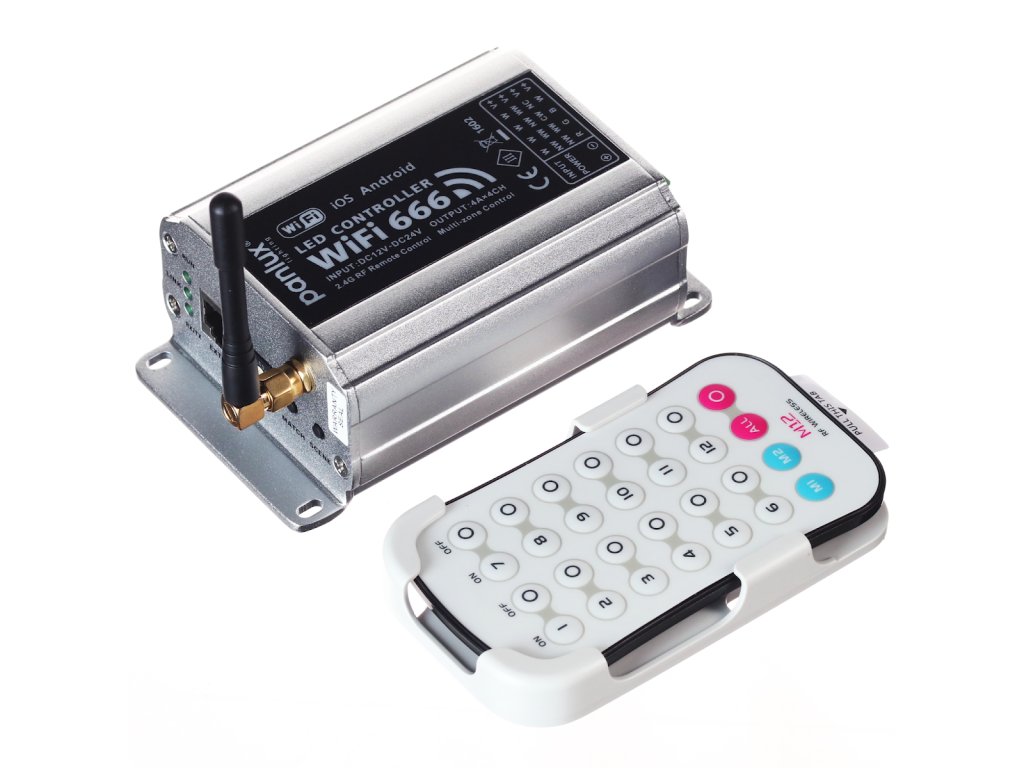Inteligentny system Wifi 666 umożliwia sterowanie oświetleniem domu za pomocą aplikacji zainstalowanej w telefonie komórkowym lub tablecie.12 ZONE - pozwala kontrolować do 12 oddzielnych stref oświetlenia Standardowa komunikacja: 2,4 GHz WiFi 802.11b/g/n Wyjście: PWM CV 12÷24 V= ( maks. 4 A × 4 CH maks. 16 A ) Aplikacja Wifi 666 je ogólnodostępna w Google Play (Android) i App Store (iOS). Aplikacja umożliwia (w zależności od opcji używanych w oświetleniu i źródłach): 1. Ustawienie intensywności światła(przyciemnianie) - DIM 2. Płynne nastawienie temperatury światła (od ciepłej przez neutralną po zimną białą) - TAS 3. Nastawienie koloru światła- RGB a RGBW W zestawie znajduje się pilot M12, który pozwala sterować światłami w systemie bez korzystania z telefonu.- Zasilanie pilota: BAT 3V= (CR2032) - Zasięg pilota: max 30m - Rozmiary pilota: 104 × 60 × 9 mm Do systemu można dokupić designowe bezprzewodowe, kompleksowe i funkcjonalne sterowniki na ścianę, które zastąpią zwykły przełącznik: - BEZPRZEWODOWY STEROWNIK 1 ZONE - umożliwia sterowanie 1 strefą oświetlenia- zam. nr PN780607, zam. nr PN780608 i zam. nr PN780609, - BEZPRZEWODOWY STEROWNIK 4 ZONE - umożliwia sterowanie 4 strefami oświetlenia - zam. nr PN780610 i zam. nr PN780611.