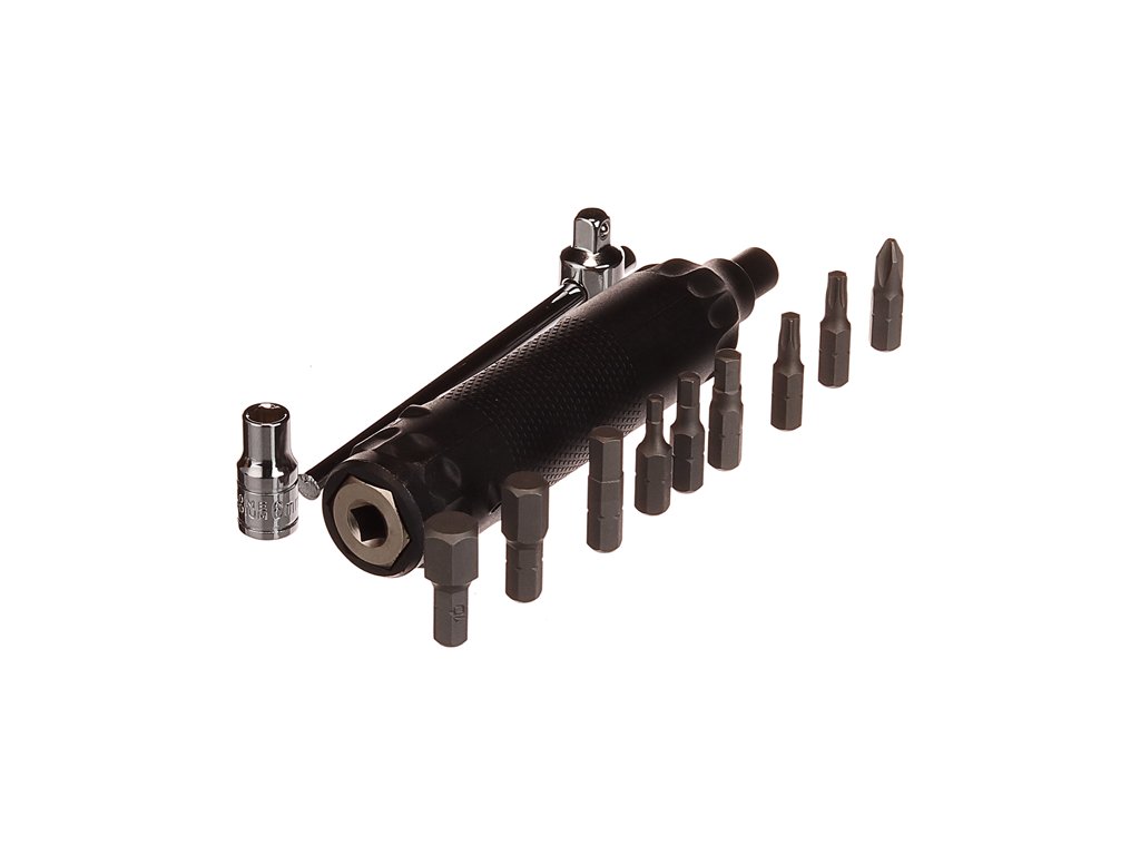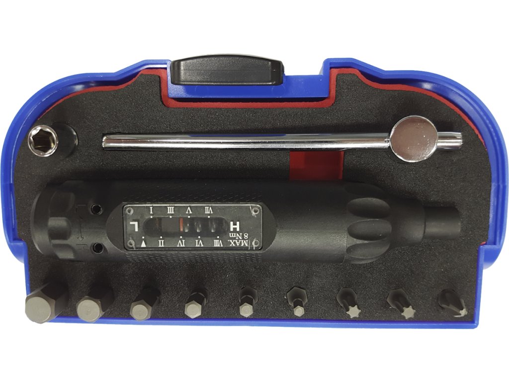 Wkrętak dynamometryczny z bitami 1–8 Nm przeznaczony jest do precyzyjnego dokręcania połączeń, szczególnie podczas serwisowania rowerów oraz innych bardziej precyzyjnych prac montażowych. Umożliwia ustawienie momentu dokręcania w określonym zakresie i pomaga zapobiegać uszkodzeniom gwintów oraz elementów.