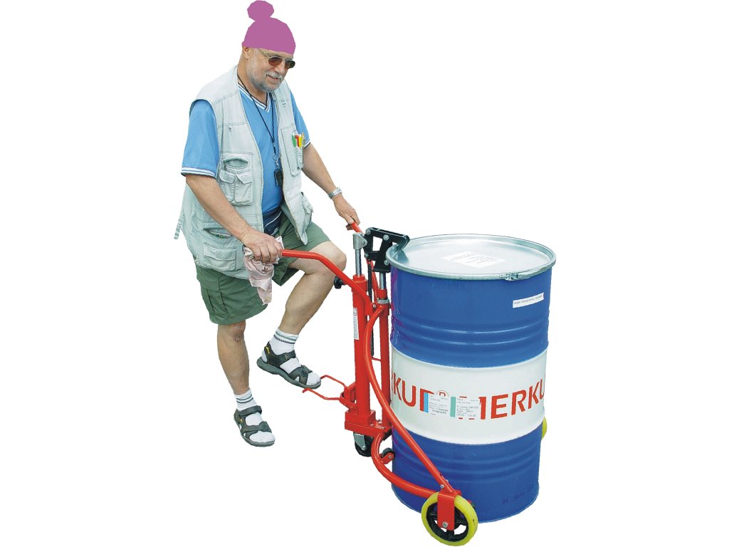 Nośność maks. 300 kg, średnica beczki 400 - 600 mm, wysokość beczki 760 - 800 mm, wznios 100 mm (hydrauliczna pompa nożna).