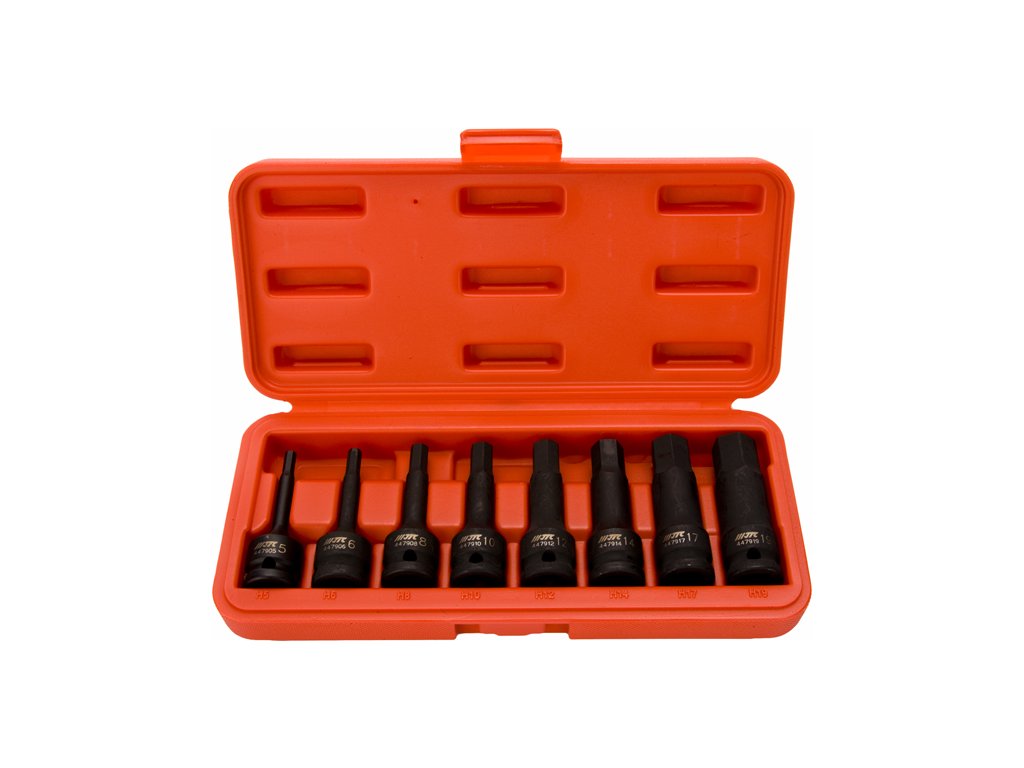 Zestaw przedłużonych kluczy nasadowych – wewnętrzny imbus 5, 6, 8, 10, 12, 14, 17, 19 mm. Przeznaczone do 1/2″ gola lub zakrętarki, zaczernione. Ułożone w pojemniku z tworzywa.
