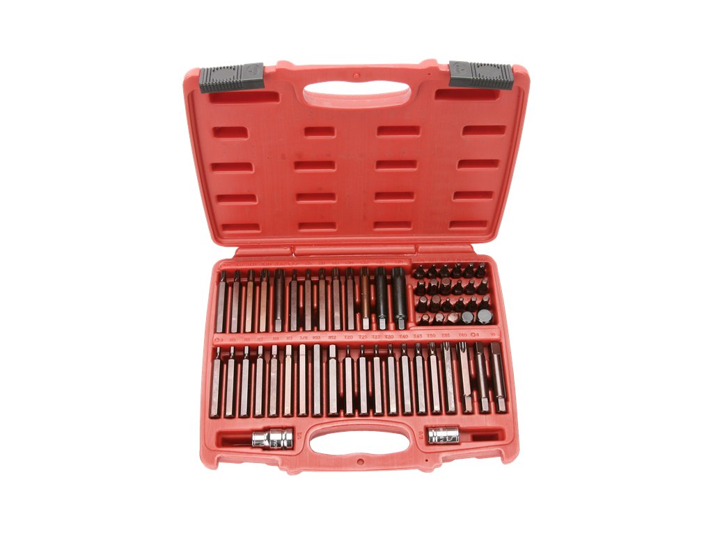 Zestaw bitów z materiału S2 w walizce plastikowej zawiera wariant przedłużony: RM6; RM7; RM8; RM10; RM12, wielowpust M5; M6; M8; M9; M10; M12; M14; M16; torx T20; T25; T27; T30; T40; T45; T50; T55; T60, hex H4; H5; H6; H7; H8; H9; 3/8; H10; H12, czworokątne 8; 10; i wariant krótki: torx T20; T25; T27; T30; T40; T45; T50; T55; T60, wielowpust M5; M6; M8; M10; M12, hex H4; H5; H6; H7; H8; H10; H12; H14; H17, i nasady gola 1/2; 3/8.