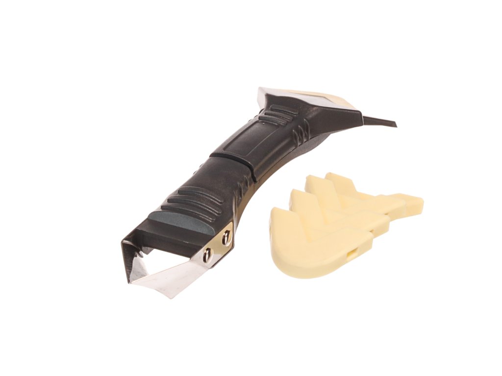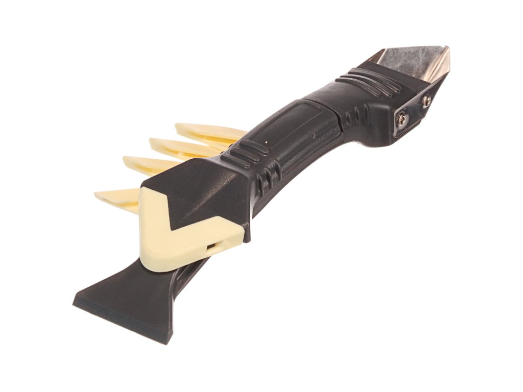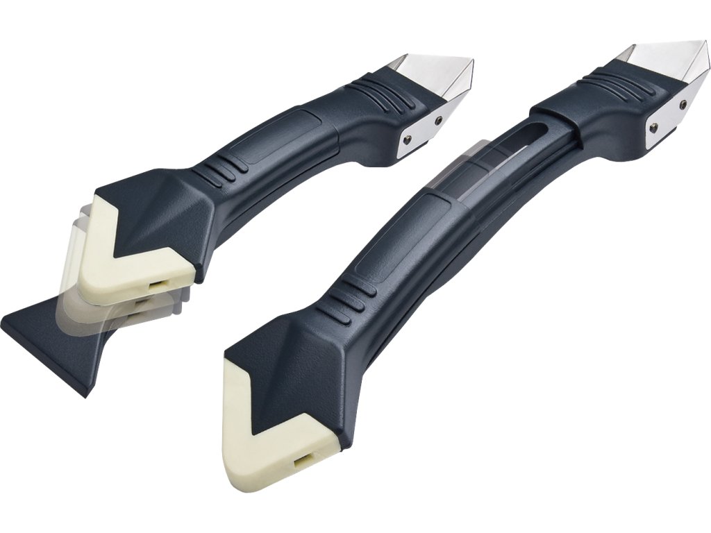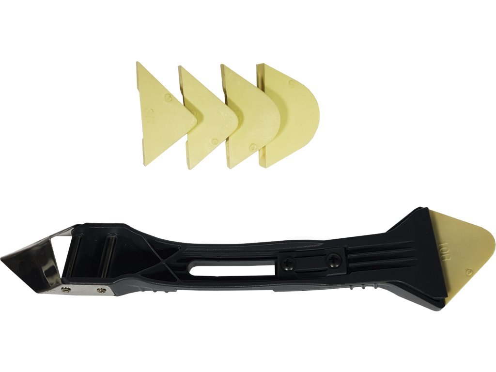 Zestaw do usuwania starego i aplikacji nowego kitu silikonowego. Zestaw zawiera kątowy i prosty nóż do usuwania starego kitu, 5 szt. wymiennych wkładów wygładzających o promieniach 3, 6, 10, 13 a 17 mm do wyrównania nowego zaaplikowanego silikonu. Korpus narzędzia jest wykonany z wytrzymałego tworzywa sztucznego..