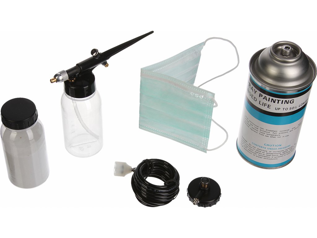 Zestaw zawiera mały pistolet do piaskowania ze zbiorniczkiem, wąż z przyłączem 1/4" do źródła sprężonego powietrza 1,4 – 3,4 atm, zbiornik z gazem zasilającym, adapter 1/4" oraz zbiorniczek ze ścierniwem 200 g. Odpowiedni do usuwania mniejszych łożysk rdzy, oczyszczania różnych materiałów, do celów dekoracyjnych, odnawiania modeli i zabawek oraz usuwania powłok malarskich z metalu i drewna. Zapakowany w pudełku papierowym.