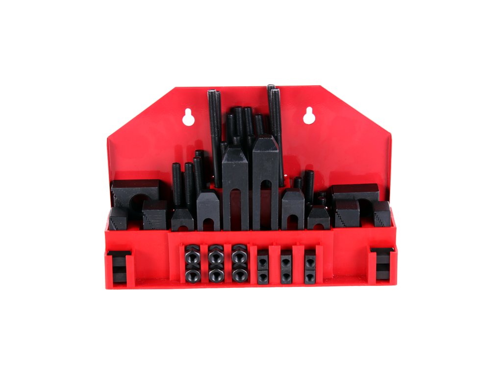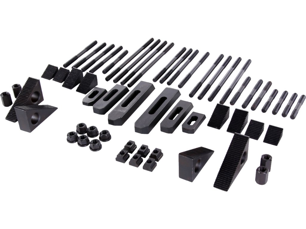 Przeznaczone do rowków teowych 12 mm. Zawiera 24 szt. popychaczy o długościach 75, 100, 125, 150, 175 i 200 mm, 4 szt.nakrętek łączących, 6 szt. segmentów T, 3 pary docisków, 6 szt. nakrętek z kołnierzem i 3 pary bloków stopniowych.