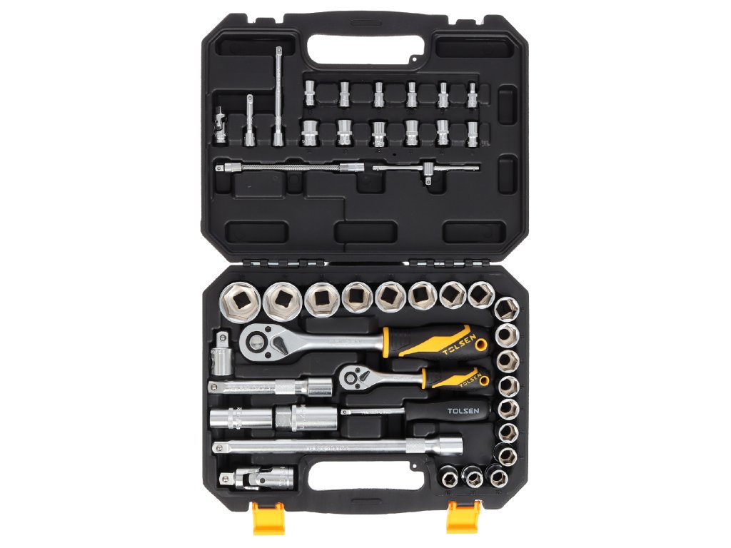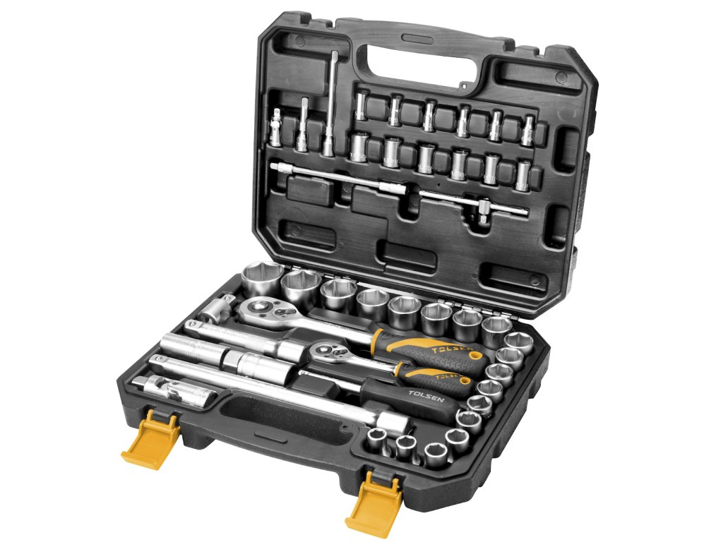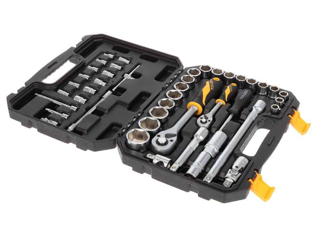 12 kluczy nasadowych 4; 5; 5,5; 6; 7; 8; 9; 10; 11; 12; 13 i 14 mm. 1 przegub kardanowy 1/4". 2 nasady przedłużające 1/4" o długości 50 i 100 mm. 1 przesuwna 1/4"