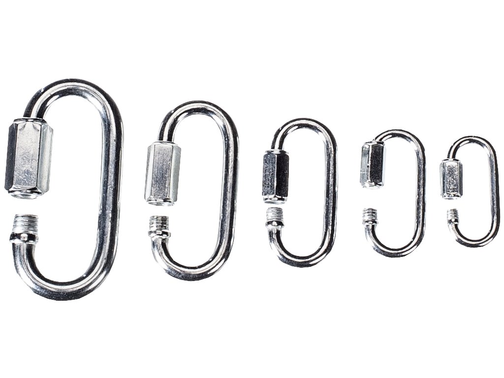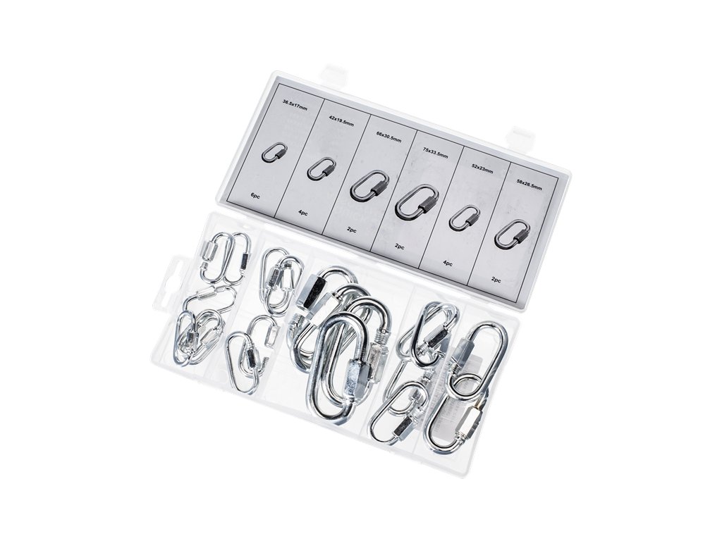 Zestaw zawiera karabinki 6 × 36 × 17 mm, 4 × 40 × 20 mm, 2 × 65 × 31 mm, 2 × 75 × 34 mm, 4 × 49 × 23 mm, 2 × 58 × 27 mm. Materiał Q215. Nośność według średnicy karabinków ø 3,5 mm – 180 kg, ø 4 mm – 220 kg, ø 5 mm – 300 kg, ø 6 mm – 400 kg, ø 7 mm – 600 kg, ø 8 mm – 800 kg. Przeznaczenie: do kotwienia lub mocowania do konstrukcji. Pakowane w plastikowym organizerze.