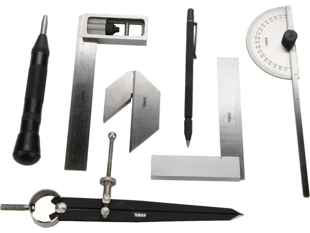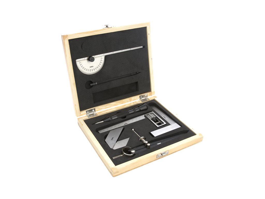 Zestaw zawiera linijkę pryzmatyczną do wyznaczenia środka okrąglaka, punktak automatyczny Profi, grot rysujący, kątownik ustawiany z linijką calową i metryczną 150 mm, stały kątownik nożowy 100 mm, kątomierz z miarką metryczną i calową 150 mm, cyrkiel rysujący.