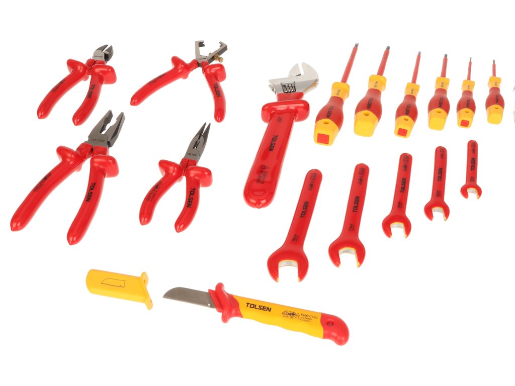 Zestaw narzędzi VDE do elektrotechniki zawiera: 200 mm izolowane kleszcze kombinowane; 160 mm izolowane kleszcze płaskie; 160 mm izolowane, boczne kleszcze do cięcia drutu; 160 mm izolowane kleszcze do ściągania izolacji; 250 mm izolowany klucz nastawny; izolowane śrubokręty płaskie: 0,4 × 2,5 × 75 mm; 0,8 × 4,0 × 100 mm; 1,0 × 5,5 × 125 mm; izolowane śrubokręty krzyżowe: PH0 × 60 mm; PH1 × 80 mm; PH2 × 100 mm; izolowane klucze płaskie 10; 12; 14; 17; 19 mm; próbnik napięcia oraz nóż do kabli. Wszystko ułożone w walizeczce z tworzywa sztucznego.
